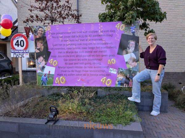 Marije Beldman is vandaag 40 jaar geworden. Haar vrienden lieten dit bijzondere moment niet ongemerkt voorbijgaan en hebben haar verrast met een feestelijk spandoek in de tuin.