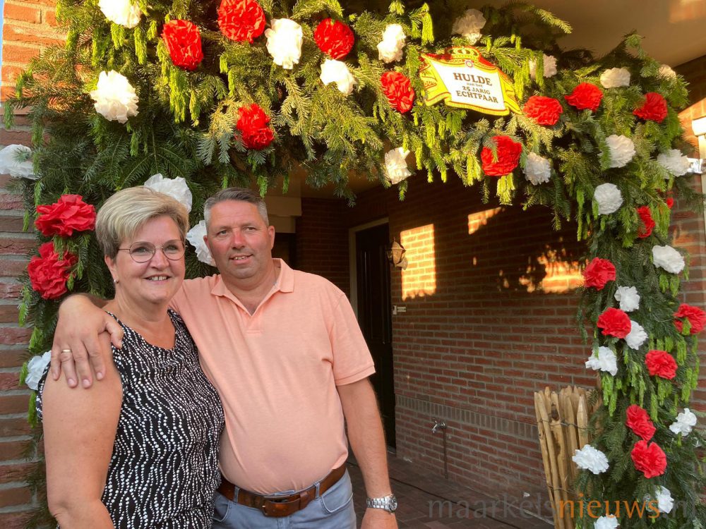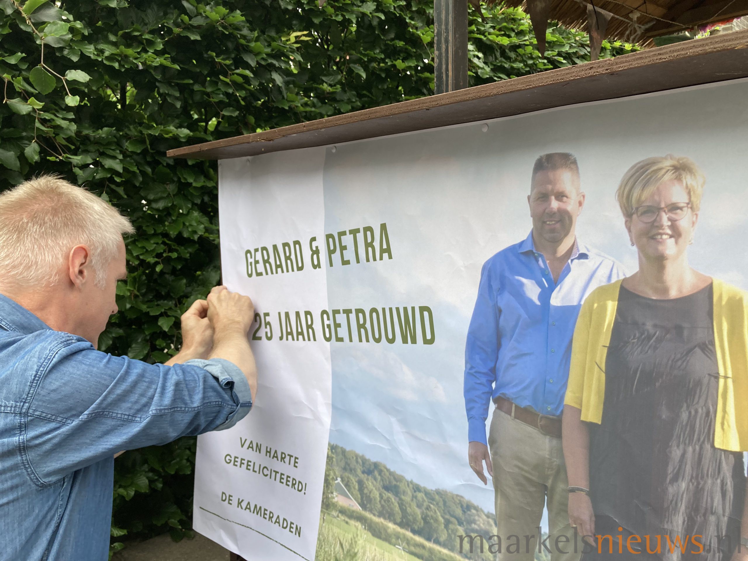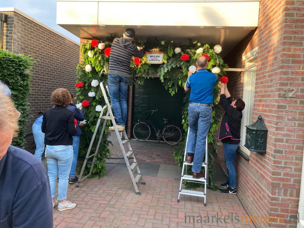 Gisteravond werd de tuin van Gerard en Petra Stokreef aan het Scheppel in Markelo door de kameraden en de buurt versierd. Een traditionele boog met witte en rode rozen werd geplaatst, maar ook een enorm bruidspaar kreeg een prominente plek. Normaal verlopen deze feestelijke werkzaamheden vanzelf in het keuren van de versieringen door het bruidspaar en wordt met een borrel geproost op het resultaat. Dat zat er gisteravond voor de buurt en de kameraden niet in want het zilveren bruidspaar was er even een weekendje tussen uit met de kinderen. Des te groter was de verrassing vanmiddag toen Gerard en Petra thuiskwamen en alle versierselen aantroffen in de tuin. Zelfs de bar die vijfentwintig jaar geleden werd gebouwd door de kameraden en hun trouwdag opluisterde was uit de stalling gehaald. Gerard en Petra: namens alle kameraden en de buurt nogmaals van harte gefeliciteerd met jullie 25-jarig huwelijk.