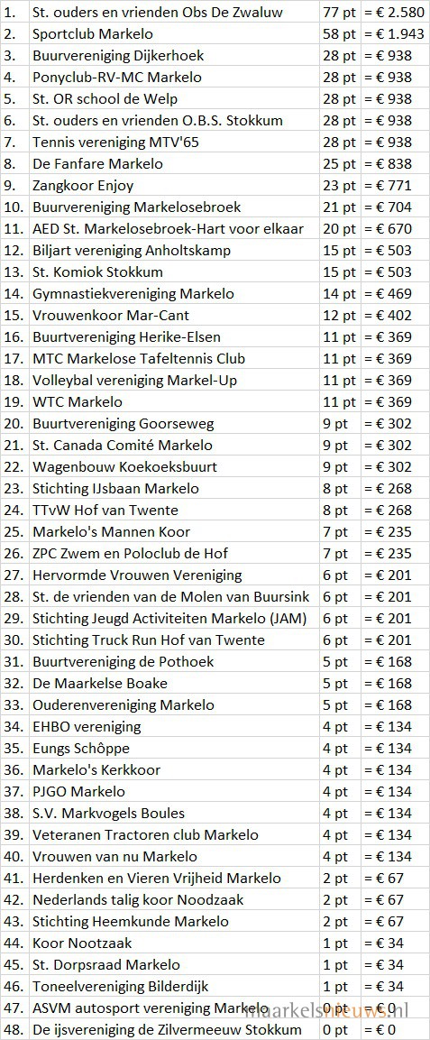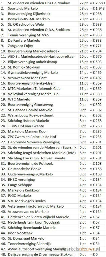 Stichting Ouders en Vrienden van Obs de Zwaluw staat met 77 punten boven Sportclub Markelo, die op dit moment 58 punten hebben gekregen van de klanten van de Markelose supermarkt. Van 5 september tot en met 13 november ontvang je bij elke 10 euro aan boodschappen en bij geselecteerde actieproducten een sponsorpunt. Je bepaalt zelf aan welke club of vereniging in Markelo je jouw sponsorpunt(en) schenkt. In totaal wordt er 20.000 euro verdeeld over de deelnemende verenigingen. De te verdelen bedragen kunnen wisselen gedurende de actieperiode en zijn afhankelijk van de ingediende sponsorpunten.