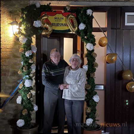 Willem en Diny Vos zijn vandaag 50 jaar getrouwd. Woensdagavond hebben de buren het jubilerende bruidspaar geëerd met een boog met witte en gouden roosjes. Uiteraard werd ook geproost op het jubileum van Willem en Diny. Gezien de harde wind van vandaag is het te hopen dat de boog standhoudt. Diny is vol vertrouwen: “Op onze huwelijksdag stond er windkracht 11, dus we zijn wel wat gewend.” Namens de buurt: van harte gefeliciteerd!