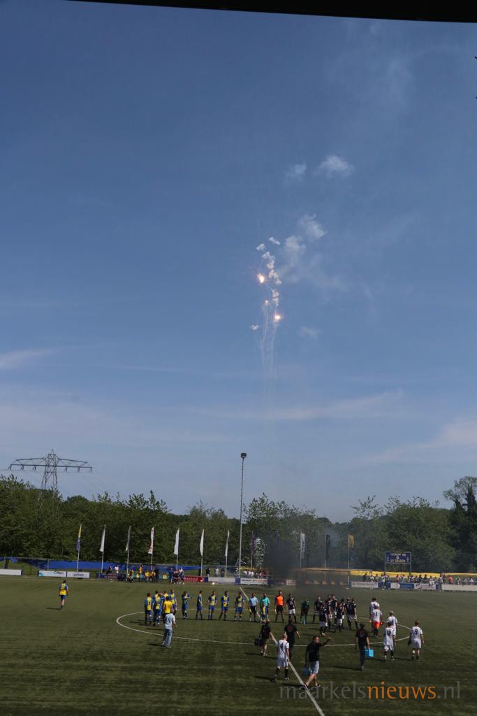 Vandaag stond een cruciale wedstrijd op het programma in de 4e Klasse B tussen SV Delden en Sportclub Markelo. Voorafgaand aan het duel was het verschil 4 punten in het voordeel van de zwart-witten. Dat het duel zo belangrijk was voor beide ploegen was ook te zien aan het vele publiek. Ruim 100 supporters uit Markelo stapten vanmiddag op de bus richting Delden om Sportclub Markelo een hart onder de riem te steken. Bij de opkomst van beide teams werd veel vuurwerk ontstoken en werden de belangen voor beide ploegen benadrukt. Dit zorgde in het begin van de wedstrijd voor extra spanning in de benen bij zowel de spelers van SV Delden als die van Sportclub Markelo. Ondanks dat kreeg het publiek een wedstrijd te zien dat op en neer golfde. Beide ploegen kregen goede kansen om de score te openen. Maar mede door goed keeperswerk van Ruben Olminkhof bleven de Markeloërs in de wedstrijd. Bij rust was de stand dan ook 0-0.