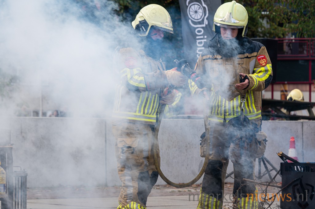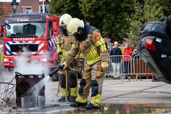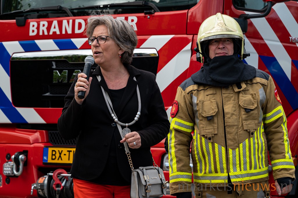 Vanmorgen om 11 uur werd de kazerne gealarmeerd voor een buitenbrand op het Kaasplein in Markelo. Deze uitruk van Brandweer Markelo werd in scene gezet met het oog op de Open Dag van Brandweervereniging Markelo die vandaag haar 75-jarig bestaan viert. Vanuit de kazerne aan de Schoolstraat werd koers gezet richting het Kaasplein. De bemanning van de tankautospuit bestond uit leden van de vrijwillige brandweer Markelo en burgemeester Ellen Nauta en haar man Robert. De brand op het Kaasplein werd vakkundig geblust door Robert Nauta. Dat nacontrole belangrijk is, bleek vrijwel direct want het vuur laaide kort weer op. Met het blussen van de brand en een openingswoord van burgemeester Nauta waarin ze de jubilerende Brandweervereniging Markelo van harte feliciteerde met hun 75-jarig bestaan, startte de Open Dag op het Kaasplein en het Roggeplein. Tot vanmiddag 16.00 uur zijn er verschillende brandweervoertuigen, demonstraties, voorlichting en voor de kinderen spelletjes en een springkussen; kortom voldoende vermaak voor jong en oud.
