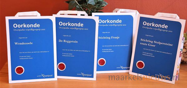 Betrokken verenigingen, onbetaalbare zorg, een groener Overijssel en meer sociale verbinding: vrijwilligers maken het mogelijk. Daarom ontvangen honderd vrijwilligers, die zich op allerlei manieren inzetten voor mens en omgeving, ook dit jaar de Overijssel vrijwilligersprijs (OVP). De Wendezoele, De Reggetuin, Stichting Stolpersteine route Goor en de Markelose locatie van Stichting Franje hebben de Overijsselse vrijwilligersprijzen in ontvangst genomen.