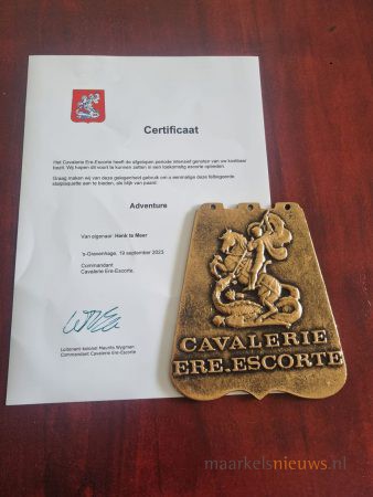 Voor de escorte van de koning op Prinsjesdag moest natuurlijk alles tot in de puntjes geregeld zijn. Zo werd Adventure een week geleden opgehaald en voorbereid op zijn taak. Zo was er afgelopen weekend een gewenningsoefening op het strand van Scheveningen. “Het is prachtig om te zien hoe ‘Ad’ het oppakte en in de groep meeliep. Voorafgaand moest er echt wel van alles worden geregeld maar we zijn enorm trots op Adventure. De stalplaquette en het certificaat die we hebben gekregen van de commandant van het Cavalerie Ere-Escorte krijgen een ereplekje in ons huis”, vertelt Henk trots.