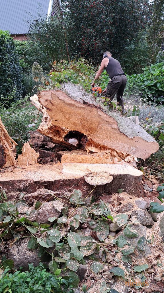 De takken van de boom zijn door een professioneel bedrijf eerst rondom gesnoeid. De enorme stam van de boom was deels hol en had veel gelijkenissen met een spons. “Het is echt een goede beslissing om de boom weg te halen maar hiermee verdwijnt gelijker tijd een stukje geschiedenis”, vertelt Gerrit Jan. De grond wordt na het verwijderen van de boom goed afgegraven en voorbereid om nieuwe leilindes te kunnen planten.