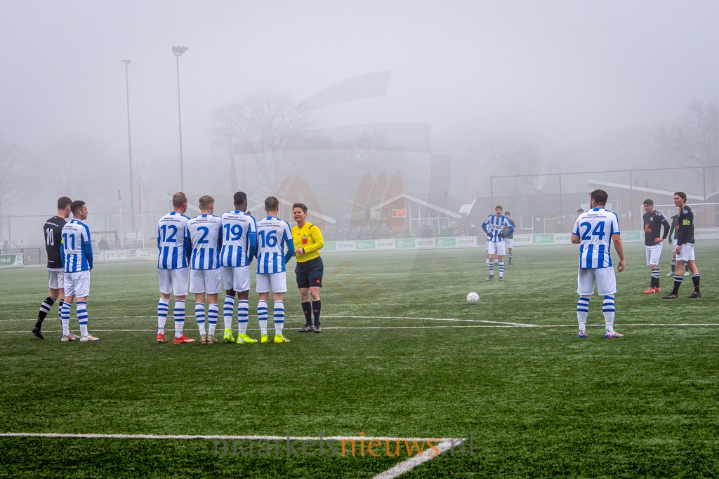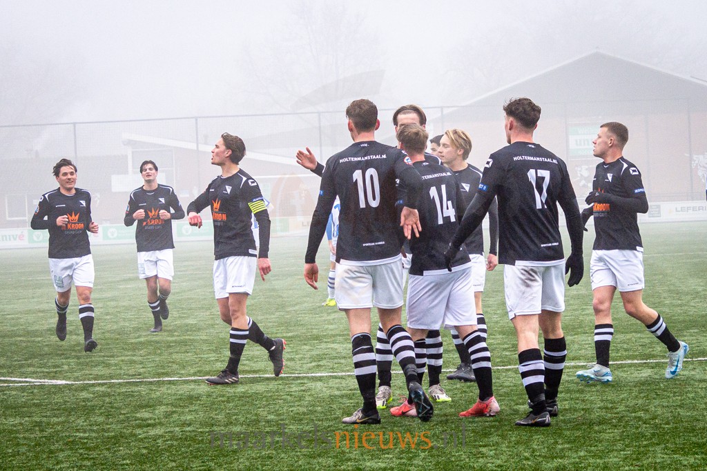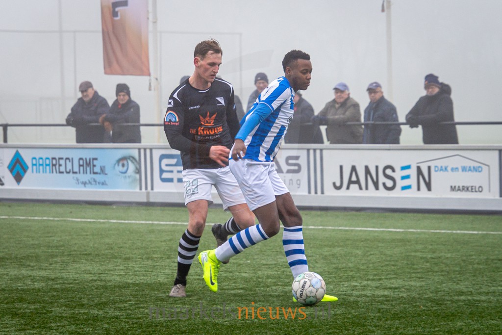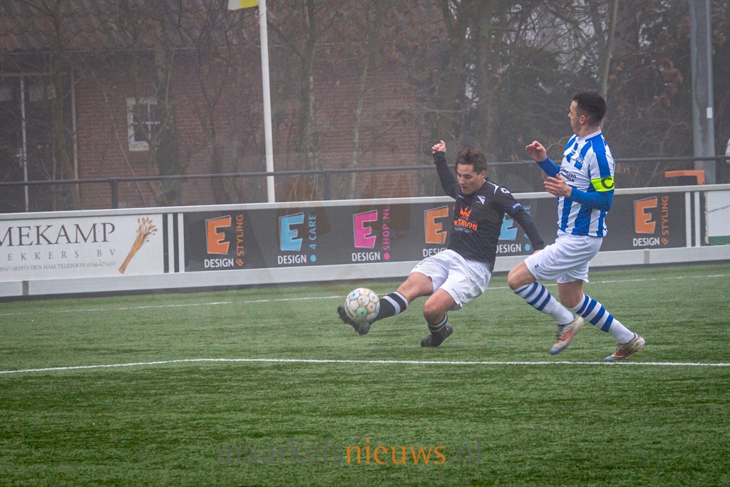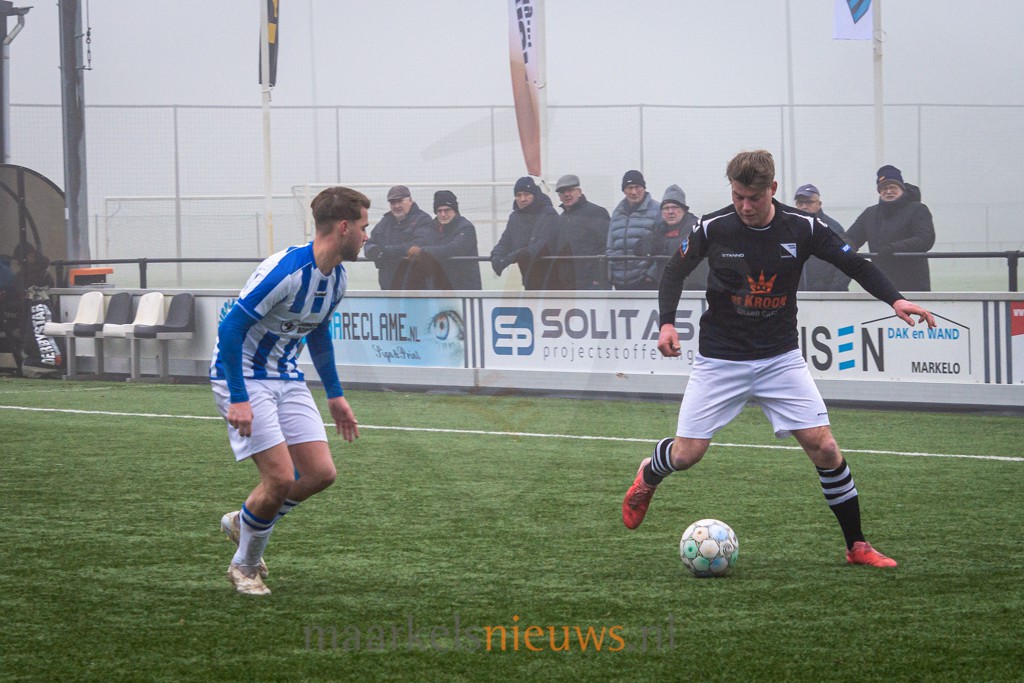 Sportclub Markelo is vanmiddag uitstekend begonnen aan de tweede seizoenshelft. Aan de eigen Endemansdijk werd Raptim uit Coevorden met 4-0 verslagen. Onder winterse omstandigheden werd er om 14:00 uur afgetrapt. Die kou was voor de bezoekers uit Coevoerden even wennen. De selectie van Raptim had zich namelijk voorbereid op de 2e seizoenshelft door op trainingskamp te gaan naar Malta. Desondanks liet Sportclub Markelo vanaf het begin zien dat het de uitstekende vorm van voor de winterstop heeft behouden. De ploeg had het betere spel en drukte dit al snel uit in de score. Na twintig minuten spelen kwam Sportclub Markelo op een 1-0 voorsprong door een doelpunt van aanvaller Miquel Schippers. De bevrijdende 2-0 liet vervolgens even op zich wachten, maar op slag van rust wist Sportclub Markelo als nog de marge te verdubbelen. Mickey Slotman tekende in de 45e minuut voor de 2-0. Zo gingen de zwart-witten met een comfortabele en verdiende voorsprong de rust in. In de tweede helft bleef de ploeg van Thijs Houwing de bovenliggende partij.