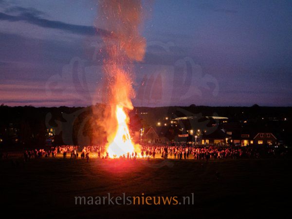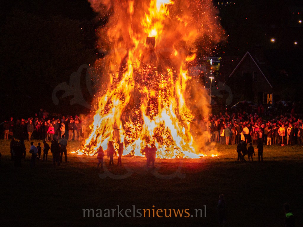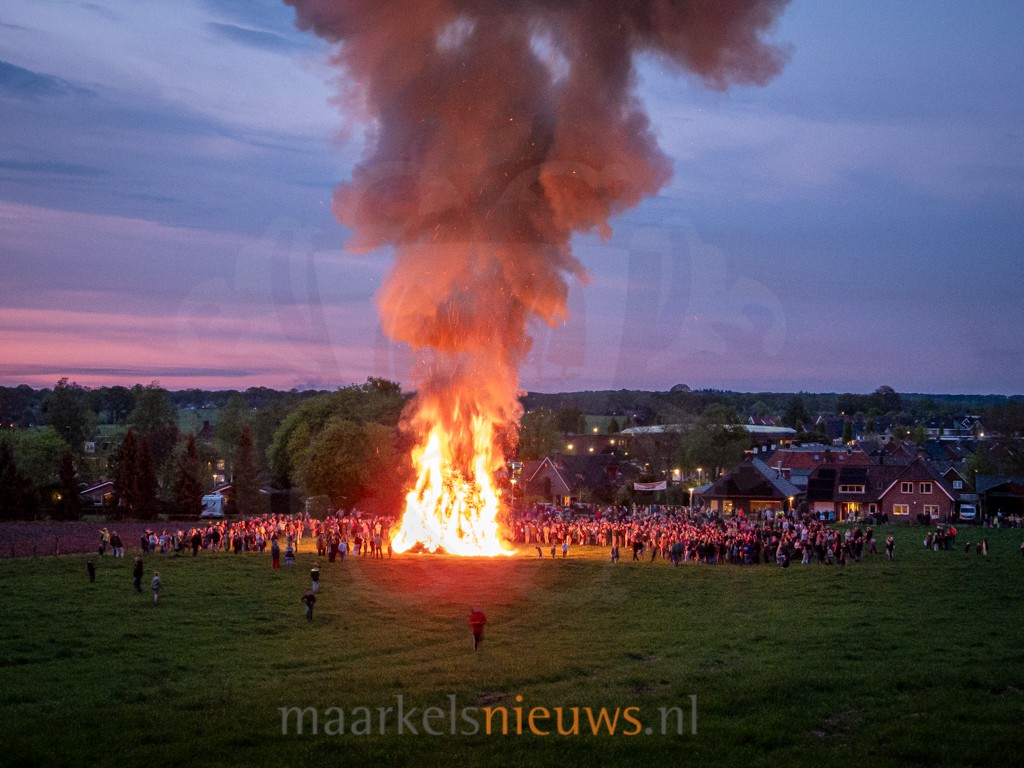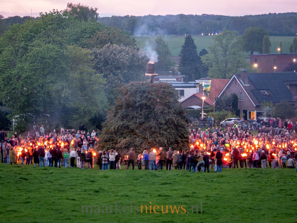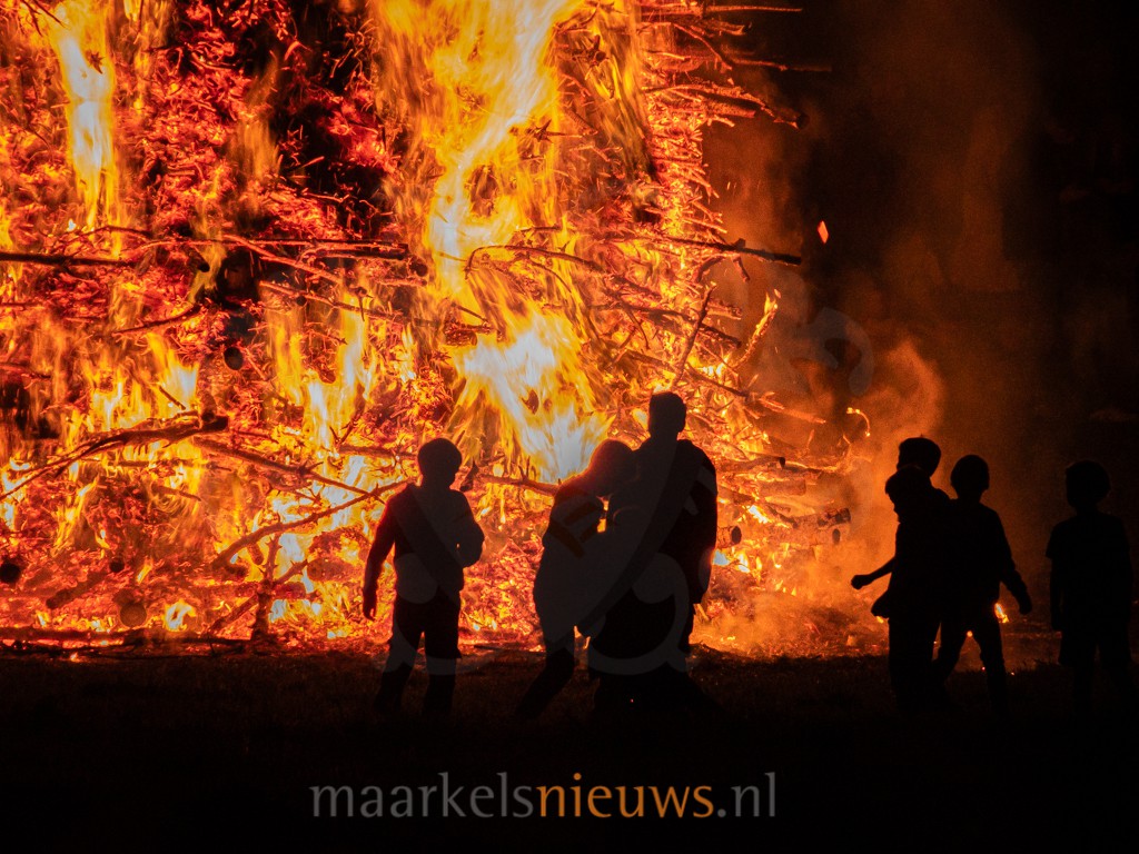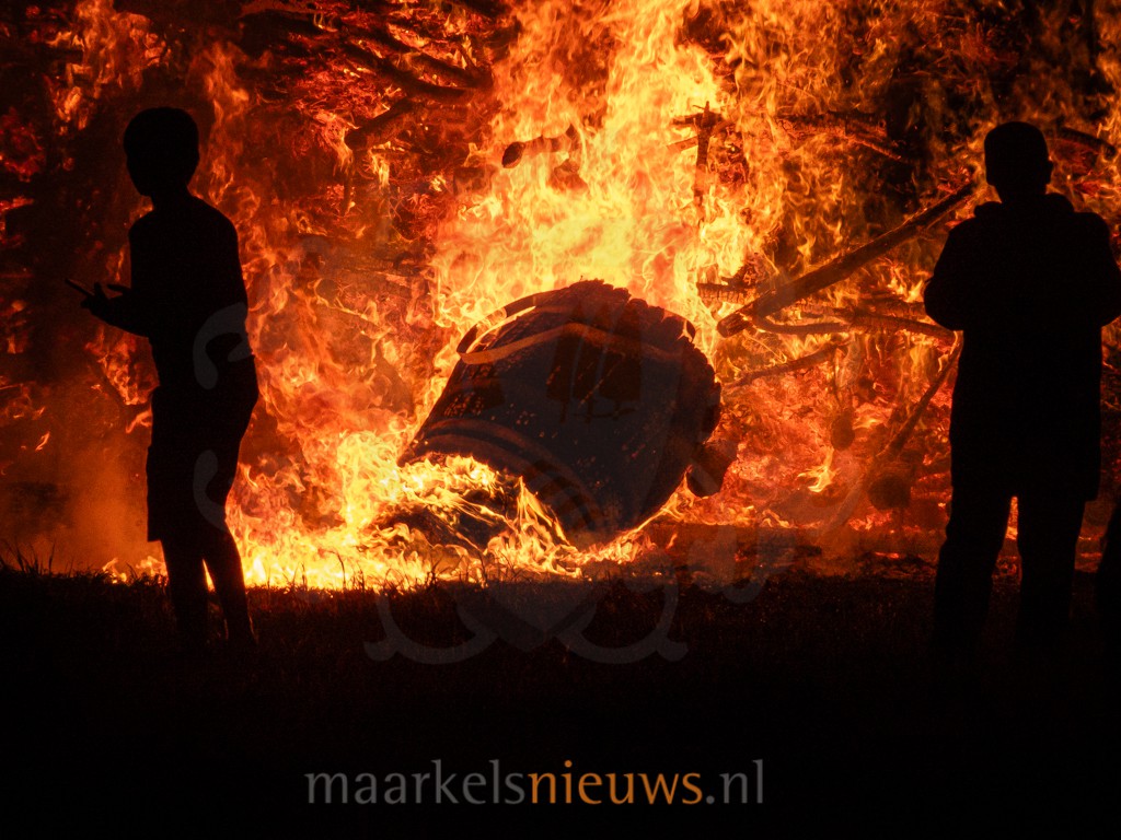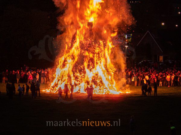 De Maarkelse Boakebouwers stonden hen daar al trots op te wachten. Even na 21.00 uur klonk het sein: de kinderen mochten met hun fakkels het vuur rondom aansteken. Terwijl de vlammen omhoog likten, klonk er opnieuw muziek van De Fanfare en ging – geheel volgens traditie – de doos met Mars repen rond voor de jonge deelnemers. De spanning liep vervolgens op, want iedereen keek uit naar hét moment van de avond: de ton. Die kwam exact om 21.22 uur onder luid applaus en gejuich naar beneden. Een mooi sluitstuk van een traditie die elk jaar weer leeft in het dorp.