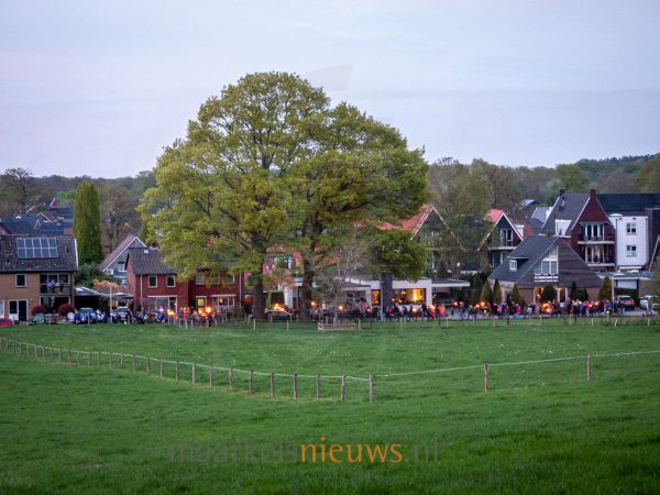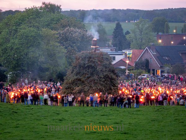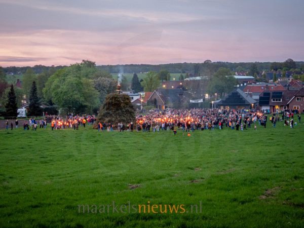 In een lange sliert van licht trok vanavond de fakkeloptocht vanaf het Kaasplein richting de flank van de Markeloseberg. Onder muzikale begeleiding van Muziekvereniging de Fanfare liepen tientallen kinderen, ouders en belangstellenden richting de boakeweide van Hargeerds waar al wekenlang werd gebouwd aan de Maarkelse Boake.