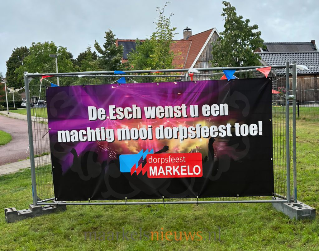 De Esch is er al helemaal klaar voor en wil dat iedereen in Markelo graag laten weten gezien het enorme spandoek dat is geplaatst en de vele rood-wit-blauwe vlaggetjes in de buurt. Kortom de vlag boven Markelo wappert, de voorbereidingen zijn overal in volle gang en de voorpret groeit met de dag. Volg het voorbeeld en hijs de Dorpsfeestvlag ook in de top. Zoek de straatversiering vast op en laten we Markelo met elkaar in de bekende Dorpsfeestsfeer brengen!|