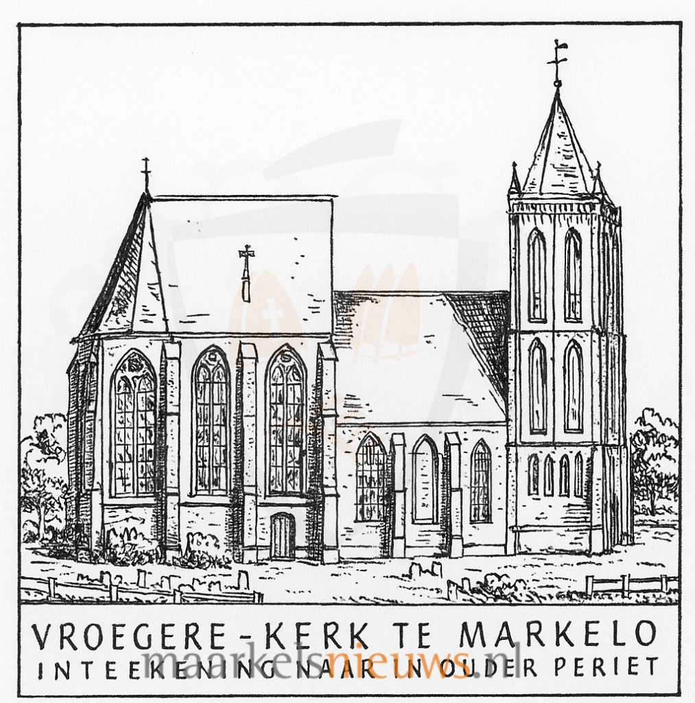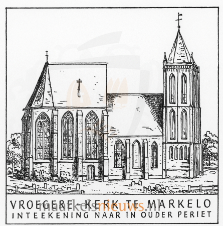 Historische tekening van de Martinuskerk in Markelo, gebaseerd op een oudere prent. Deze schets laat zien hoe het kerkgebouw er vroeger uitzag, inclusief de karakteristieke toren en gotische ramen.