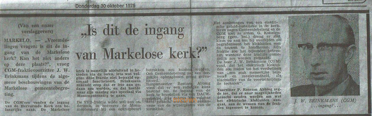Krantenknipsel uit 1975 waarin CGM-fractievoorzitter J.W. Brinkmans zich afvraagt waar de ingang van de Markelose kerk is. Vijftig jaar later is die oorspronkelijke ingang aan de Grotestraat weer geopend.