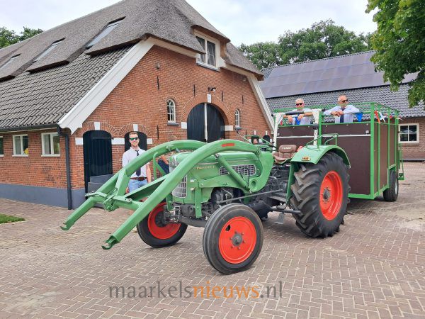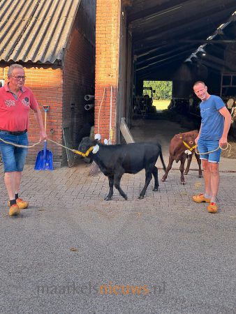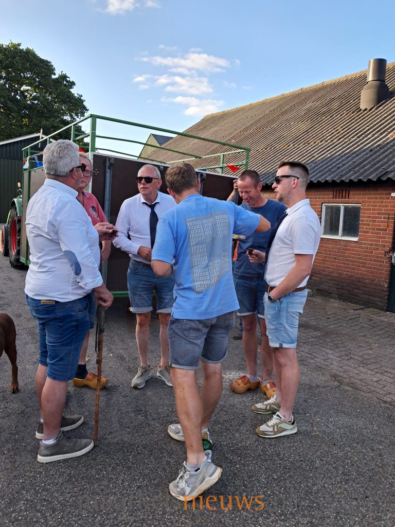 Zaterdagmiddag zijn de bruidskalfjes van Gerwin en Michelle op traditionele wijze door de buren opgehaald. Vanaf de Kappelaarsdijk trok men in optocht, met een oldtimer en wagen, richting de Petersweg. Bij de televisietoren stonden de noodnoabers van de familie Altena al klaar. Zoals de traditie voorschrijft, werd er stevig onderhandeld over de prijs van de kalfjes. Daarbij vloeiden de borrels rijkelijk, want zulke mooie Dexterkalfjes laat men natuurlijk niet zomaar vertrekken. Wim, Dinant en Jarno namen de taak op zich om de kalfjes goed te keuren, terwijl Han en Bennie de dieren keurig voorleidden. Uiteindelijk werd de handel beklonken en konden de kalfjes worden ingeladen.