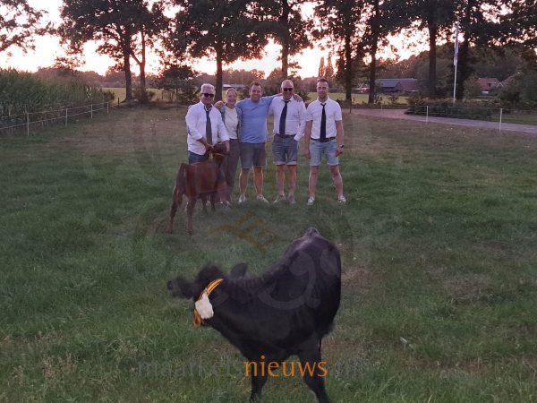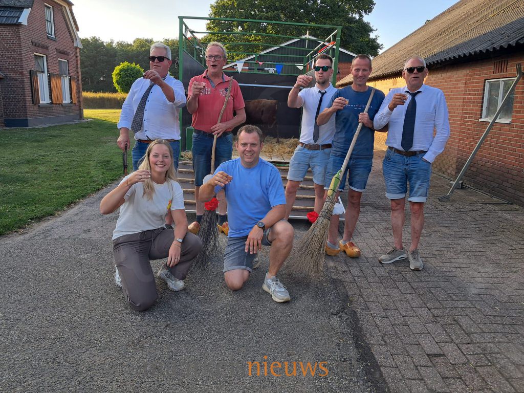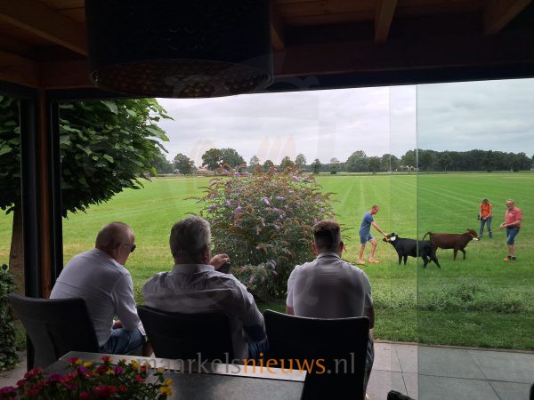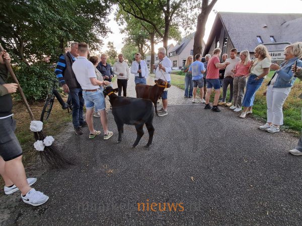 De stoet trok daarna verder naar Stokkum, waar de buurt van de Petersweg al stond te wachten. Ook hier ging het niet zonder slag of stoot: pas na het nodige ‘meuten’ mochten de kalfjes het erf van Gaitbrinkert betreden. Toen het donker begon te worden, mochten de dieren eindelijk hun nieuwe wei aan de Petersweg in. Daarmee was het feest compleet en werd alvast een vrolijke voorproef genomen op het aanstaande huwelijk van Gerwin en Michelle. De buurt wenst de nieuwe eigenaren veel geluk met de kalfjes en een mooie toekomst samen aan de Petersweg.