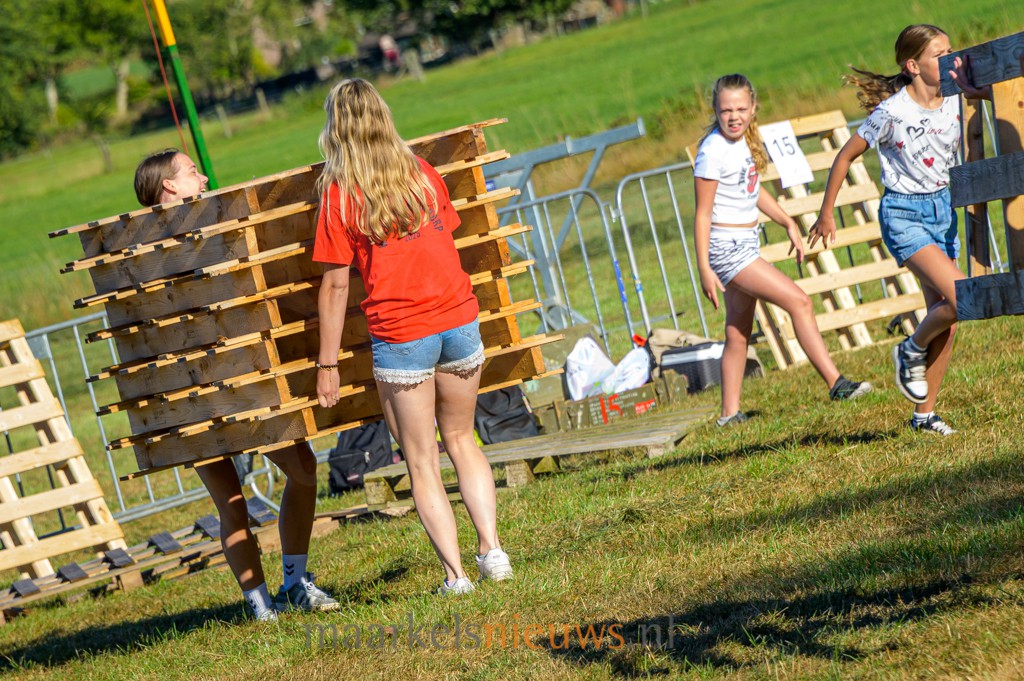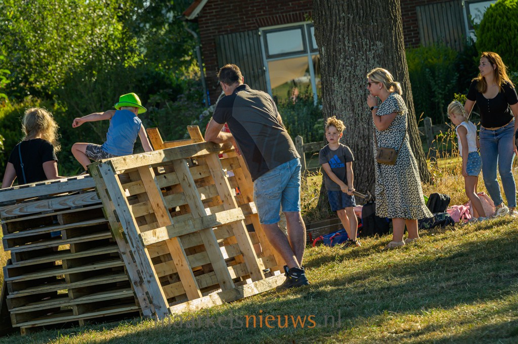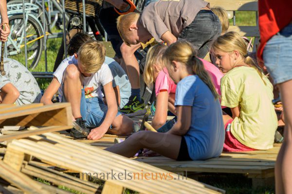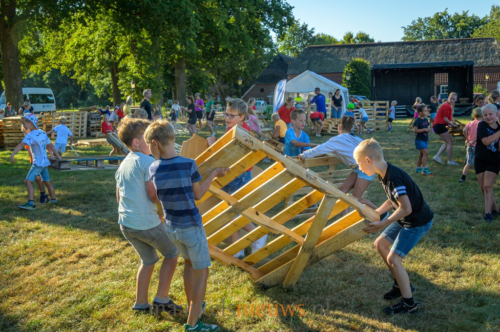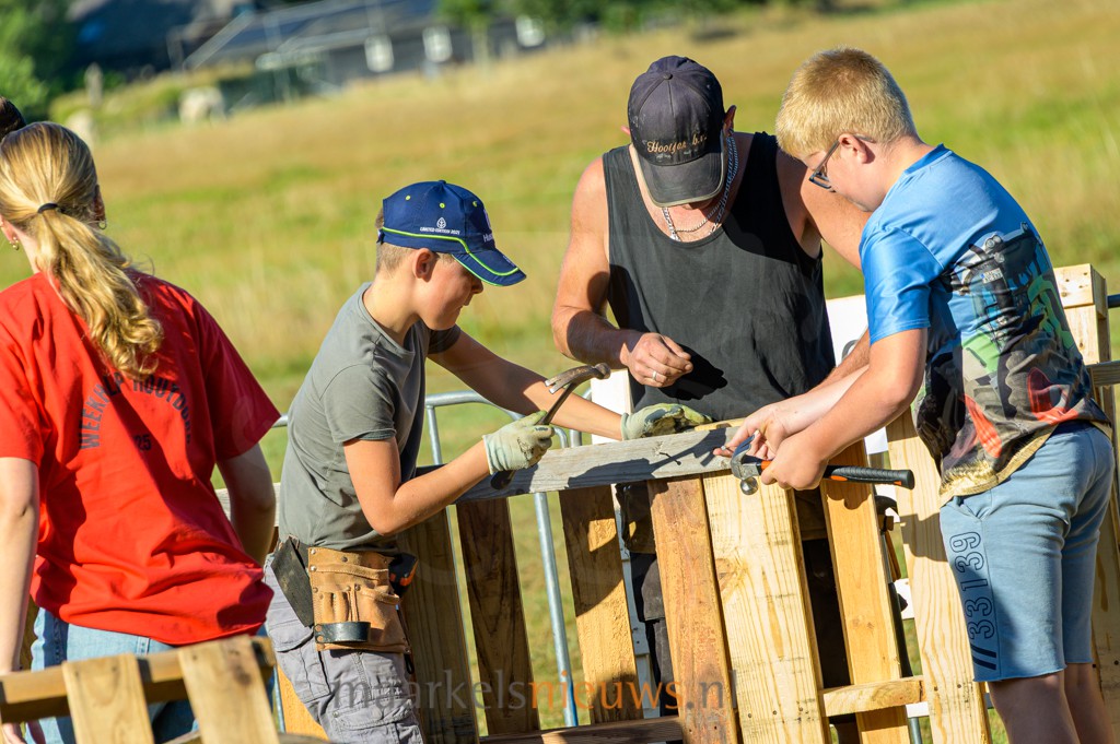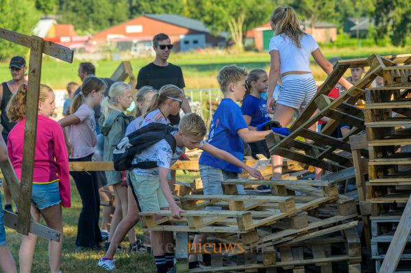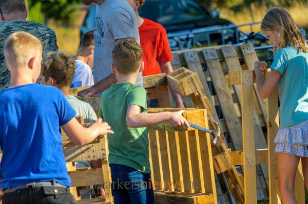 Bijna tweehonderd kinderen zijn vanmorgen vol enthousiasme begonnen aan de kindervakantieweek Houtdorp, georganiseerd door Jeugd Aktiviteiten Markelo. Op het terrein naast Herberg de Pot bouwen zij drie dagen lang aan hun eigen hutten, samen met ouders en weekhulpen. Onder een strakblauwe lucht werden de pallets vanmorgen in hoog tempo verdeeld en klonken al snel de eerste hamers. De komende dagen staan in het teken van timmeren, schilderen, versieren en spelen. Vandaag lag de nadruk op het bouwen van de hutten. Woensdag worden de laatste planken vastgezet en kan er geschilderd worden. De organisatie vraagt ouders om de deelnemers een kwast en verfbakje mee te geven.