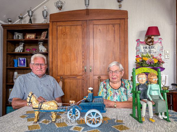 In de hoek van de kamer staat een paard en wagen, volledig vervaardigd uit hout. Het is het resultaat van uren knutselen van Derk samen met zijn kleindochter Lianne. Hier komt geen machine aan te pas. Het handwerk is tot in detail uitgevoerd: met behulp van draadjes en andere materialen is het geheel zelfs beweegbaar gemaakt. De kar kan kiepen en zelfs de armen en benen zijn in beweging te zetten.