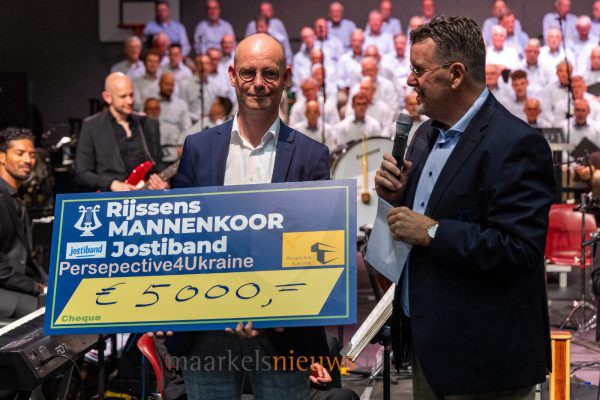 Een goed gevulde sporthal kon gisteravond genieten van een sfeervol benefietconcert. Verantwoordelijk daarvoor waren het Rijssens mannenkoor en de Jostiband. Speciaal voor deze gelegenheid was de Markelose sporthal omgetoverd tot een heuse concertzaal waar enkele honderden toeschouwers een plaats vonden en konden luisteren naar prachtige koorzang van het koor en fijne muziek van de Jostiband. De opbrengst van het concert is bestemd voor het project Perspektive4Ukraine. Dit project zet zich in jongeren in Ukraine met een verstandelijke beperking middels onder andere opleiding, medische zorg en woonvoorzieningen. In het eerste deel van het concert zong het koor voornamelijk repertoire met een geestelijke inslag met nummers als ‘God and God alone’ en ‘In the sweet by and by’. De Rijssense zangers bewezen niet alleen fraaie koorzang te kunnen brengen maar bleken ook over een aantal goede solisten te beschikken. Ook de muziek van de Jostiband sloeg aan bij het publiek. Deze band uit Zwammerdam bestaat uit musici met een verstandelijke beperking. De band is bekend van vele TV-optredens en heeft al opgetreden in vele landen in en buiten Europa. Zij openden hun programma met het bekende Halleluja, bekend van Leonard Cohen maar ook met een eigen interpretatie van het kinderliedje ‘Twee emmertjes water halen.’ Na de pauze stond het programma van het koor in het teken van wat meer populaire liedjes zoals ‘The Rose’ van Bette Midler en ‘Bridge over troubled water’ bekend van Simon en Garfunkel. De Jostiband speelde ‘Can’t help falling in love’ en het vrolijke ‘Viva la Vida’. Het concert kreeg aan het eind van de avond nog een groot meezinggehalte met de liedjes ‘Als de klok van Arnemuiden’ en ‘Het kleine café aan de haven’. Besloten werd met het mooie ‘You raise me up’.