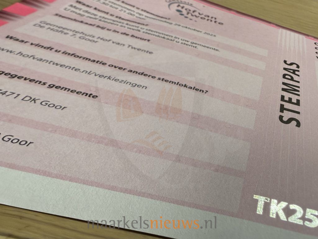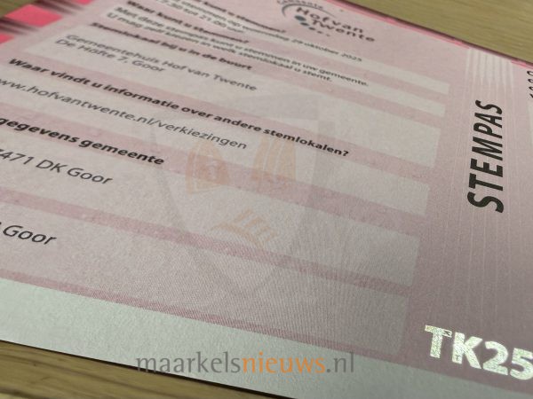 De stempassen voor de Tweede Kamerverkiezingen van woensdag 29 oktober zijn inmiddels bij de inwoners van Markelo op de mat gevallen. Daarmee is de officiële aftrap van de verkiezingsperiode gegeven. Met de stempas kunnen kiesgerechtigden hun stem uitbrengen en zo mee bepalen welke partijen en kandidaten de komende jaren plaatsnemen in de Tweede Kamer. De Tweede Kamer beslist over wetten en regels die ons dagelijks leven raken, zoals zorg, onderwijs, wonen en veiligheid. Door te stemmen, laten inwoners weten wat zij belangrijk vinden en welke koers Nederland volgens hen moet varen. Wie gaat stemmen, neemt de stempas én een geldig identiteitsbewijs mee naar het stembureau. In Markelo kan dit bij Woonzorgcentrum Anholtskamp, Fotostudio Markelo in de Kaasfabriek Markelo, Sporthal Markelo, Elserike, ’t Gebouwtje in Stokkum en bij de Brookschole.