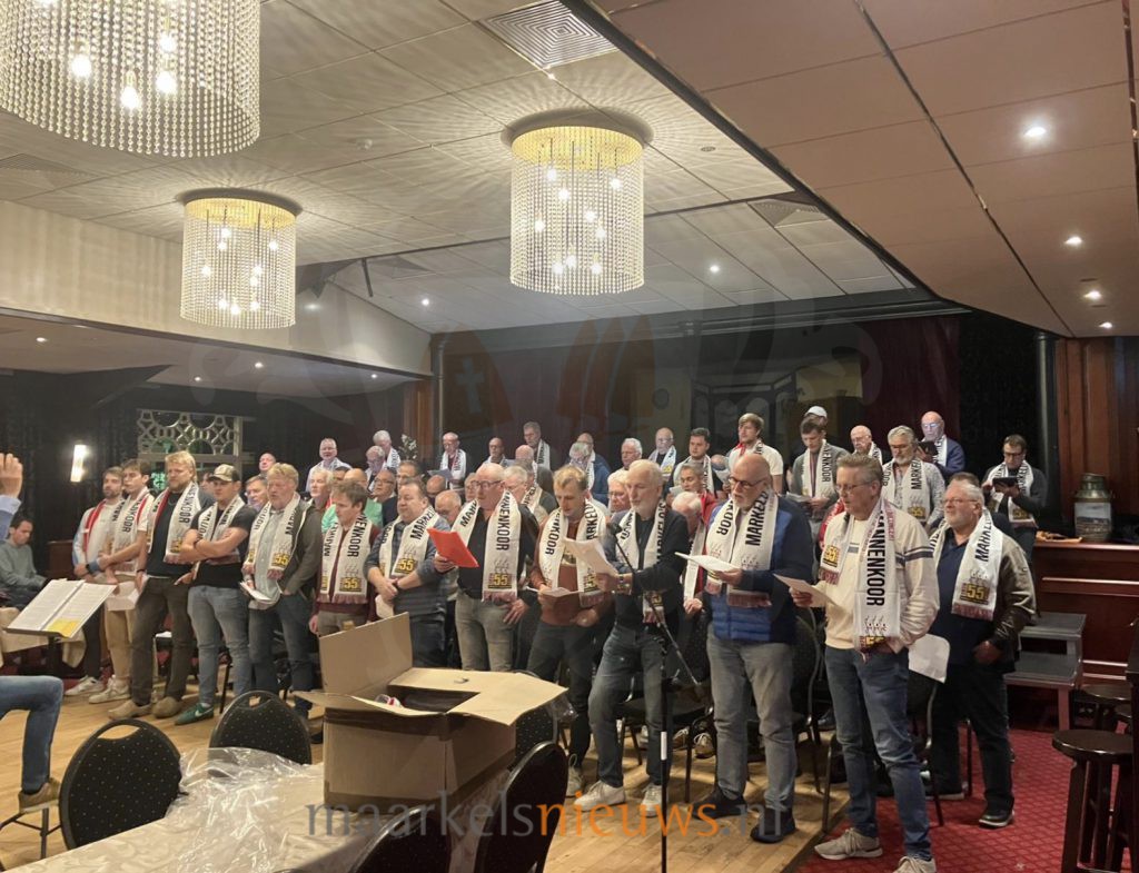 De laatste repetitie van het Jubileumkoor MetMeKa, dat speciaal is samengesteld voor het 55-jarig jubileum van het Markelo’s Mannenkoor, verliep gisteravond als een generale repetitie. De puntjes werden op de i gezet en de zangers werden voorzien van een heuse fansjaal van het Markelo’s Mannenkoor. Onder leiding van dirigent Hans Kienhuis werd het volledige programma nog eens doorgenomen. De zangers zijn morgenavond tijdens het jubileumconcert allemaal te herkennen aan hun jubileumsjaal. “We zijn er klaar voor en hebben er ontzettend veel zin in,” laat Alexander Compagner namens het koor weten.