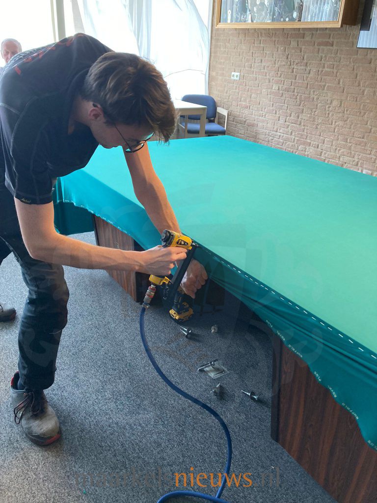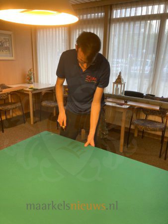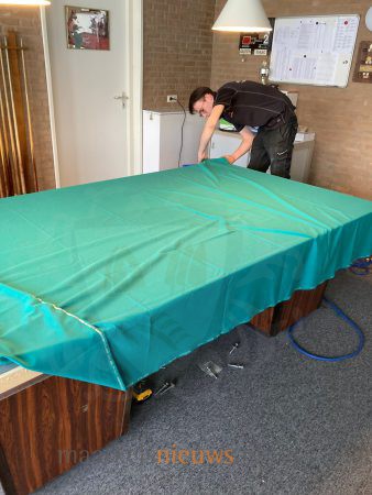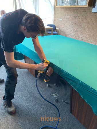 Ook biljartwinkel Dibo uit Deventer speelde een belangrijke rol bij deze vernieuwing. Zij leverden niet alleen het materiaal, maar zorgden ook voor de vakkundige montage. Een leuk detail: het nieuwe laken werd aangebracht door niemand minder dan Sam Groot Roessink, de Biljartkoning van 2025. Sam is werkzaam bij de biljartwinkel en bracht in die rol het laken zelf aan.