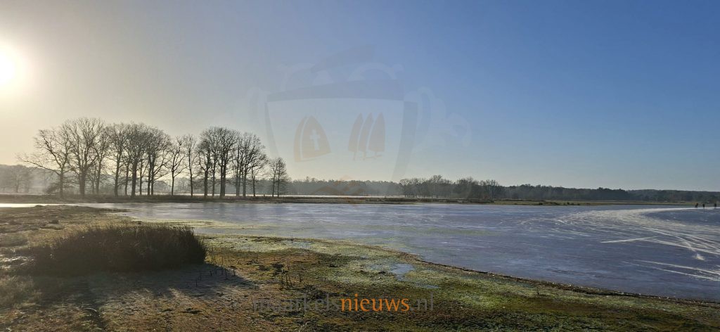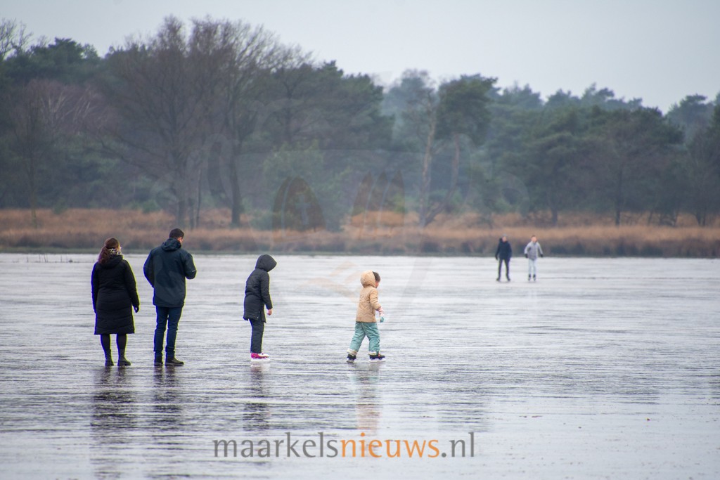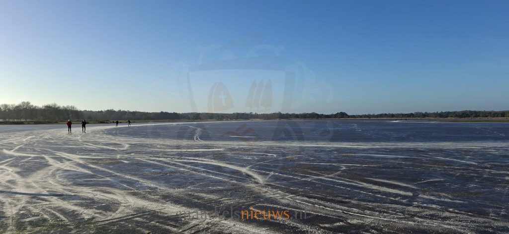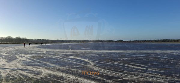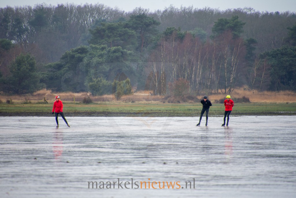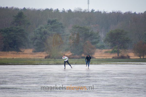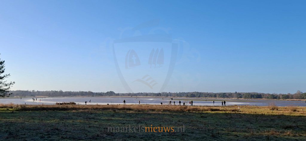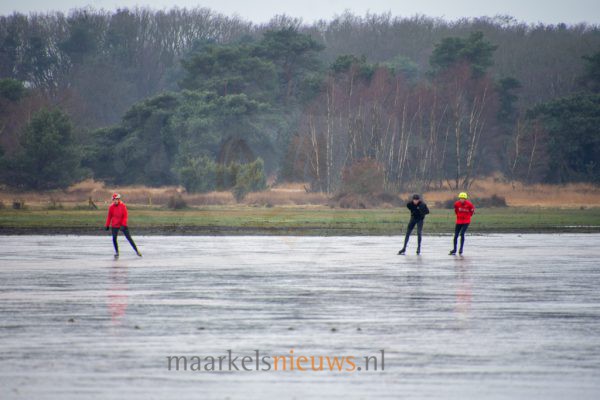 Waar de ijslaag op de ijsbaan in Markelo vanmorgen helaas niet dik genoeg bleek om te schaatsen, werd er op de Borkeld nog wel op natuurijs geschaatst. Op het Elsenerveld, in natuurgebied De Borkeld, waagden enkelen zich net als afgelopen weekend op de bevroren natuurplassen. Dat alles weliswaar op gepaste afstand onder een enkele nieuwsgierige blik van loslopende vee.