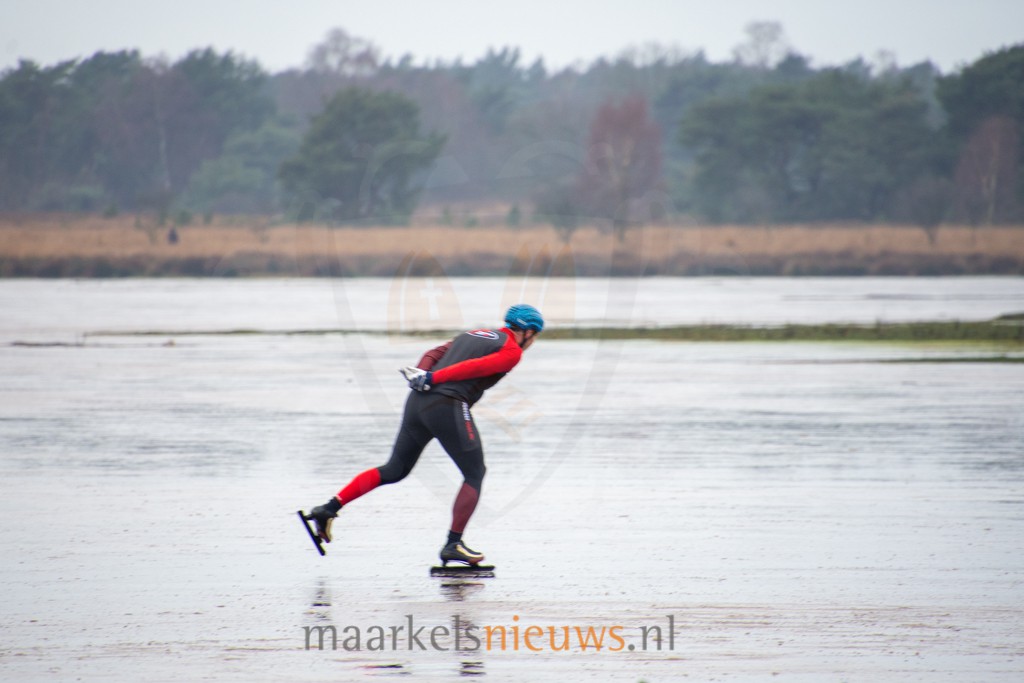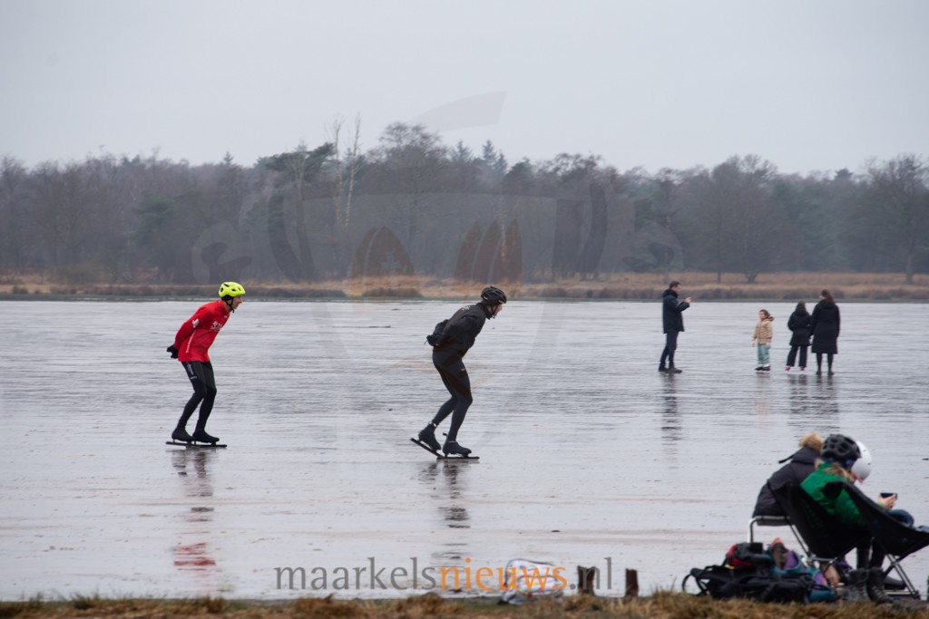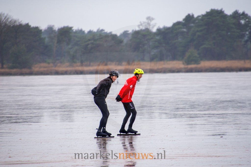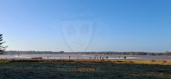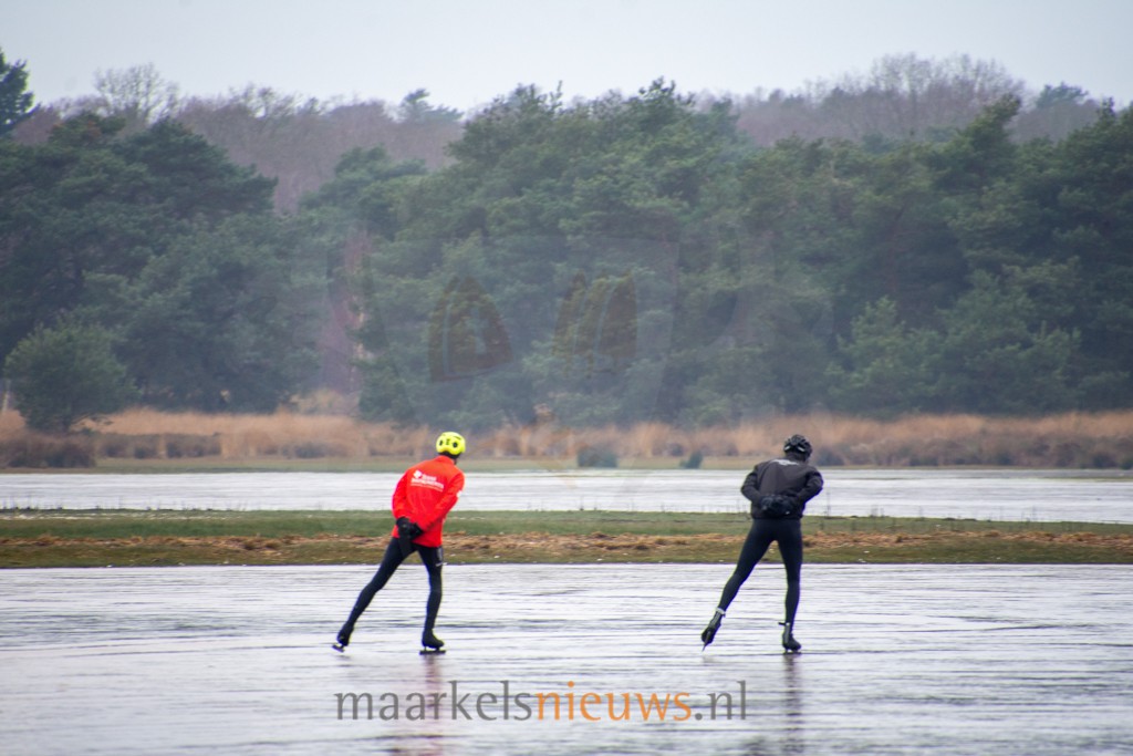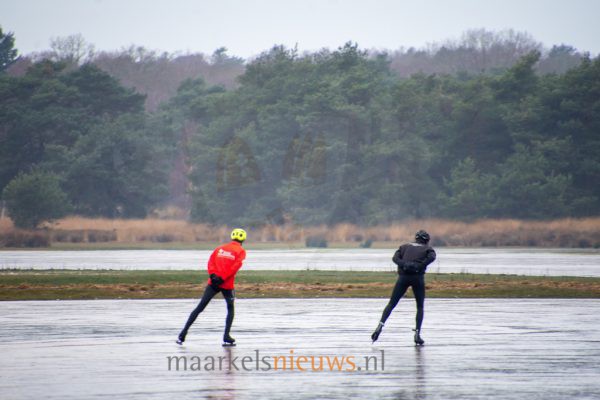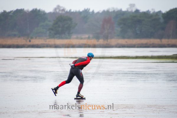 Waar de ijslaag op de ijsbaan in Markelo vanmorgen helaas niet dik genoeg bleek om te schaatsen, werd er op de Borkeld nog wel op natuurijs geschaatst. Op het Elsenerveld, in natuurgebied De Borkeld, waagden enkelen zich net als afgelopen weekend op de bevroren natuurplassen. Dat alles weliswaar op gepaste afstand onder een enkele nieuwsgierige blik van loslopende vee.