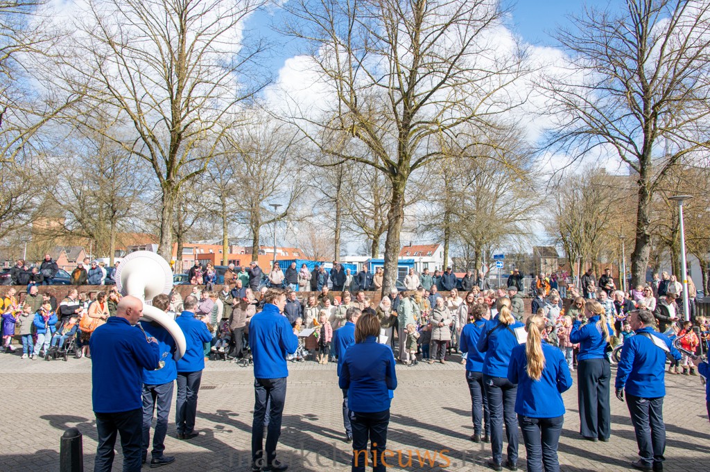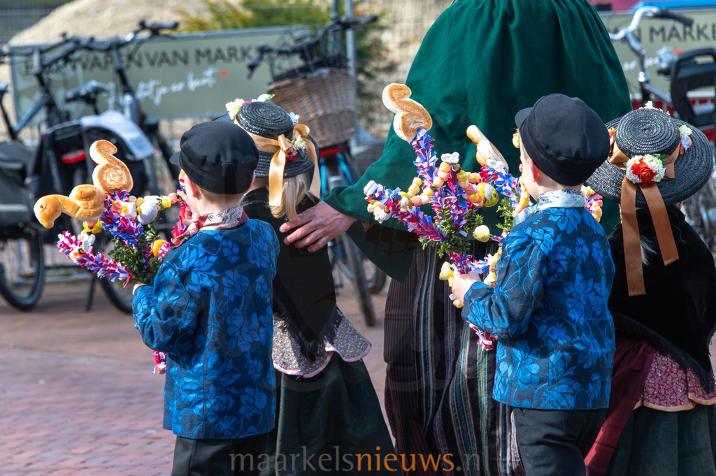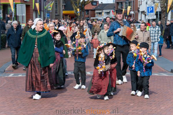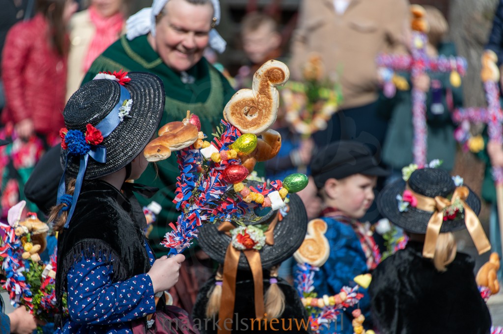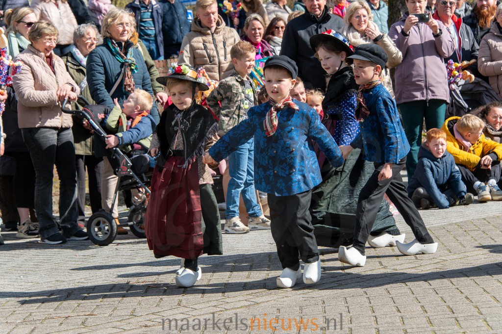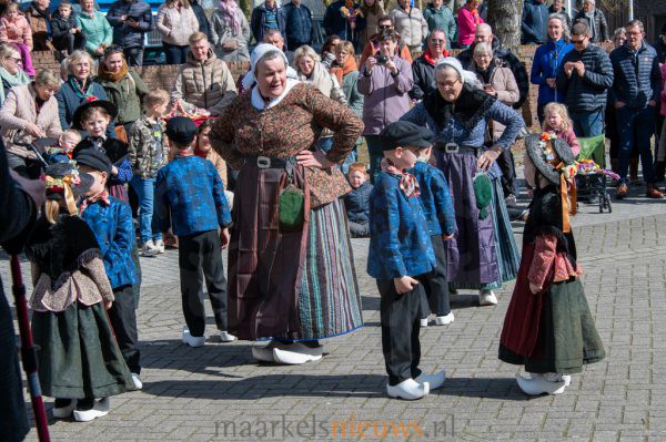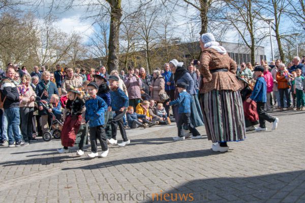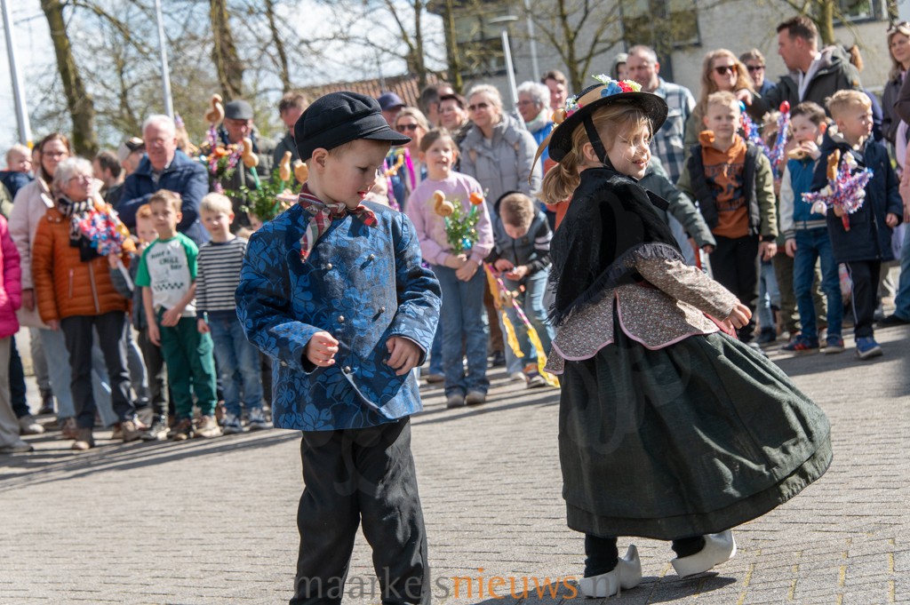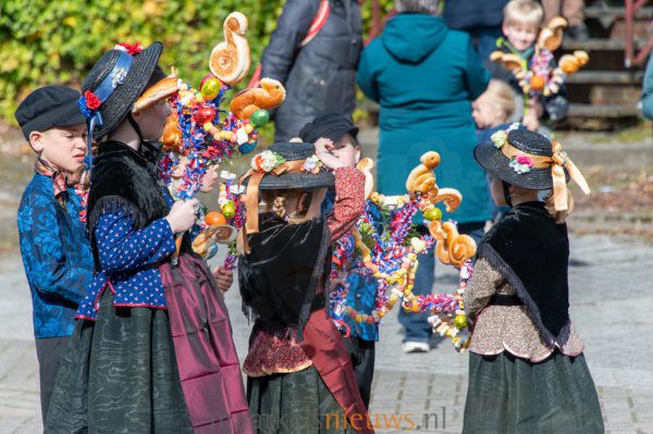 Met kleurrijk versierde palmpasenstokken en de traditionele klederdracht vormden de kinderen een vrolijk geheel. De eerste stappen waren hier en daar nog wat onwennig, maar daar was op Het Beaufortplein weinig meer van te merken. Daar liet de kindergroep vol enthousiasme de dansjes zien die zij de afgelopen weken hebben ingestudeerd.