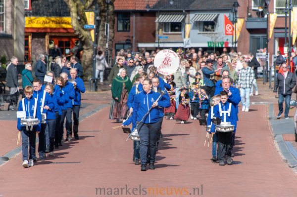 Voor de leden van muziekvereniging De Fanfare is het een druk bezet weekend. Naast de optocht verlenen zij ook hun medewerking aan de drie voorstellingen van de Passion Noabers Markelo. De vereniging is bovendien meer dan blij met de inzet van Marleen Deeterink-Dijkman, die vanmorgen haar vuurdoop beleefde als tambour-maître. Hoewel zij nog in opleiding is, was daar weinig van te merken. Met vaste hand begeleidde zij de muzikanten over de route richting het Burgemeester de Beaufortplein.