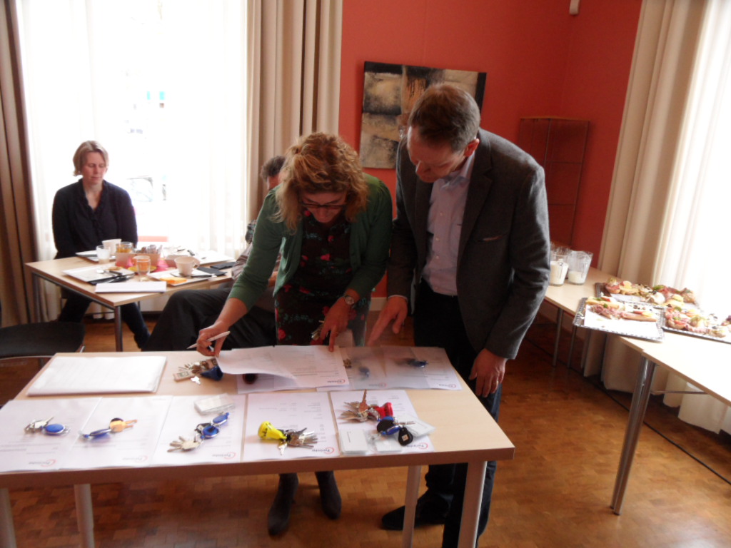 “Ik wens jullie veel succes en vooral ook veel pioniersdrift”. Met deze woorden sprak Joke Mengerink, lid van de Raad van Bestuur van Carint vanmiddag de gebruikers van het nieuwe gebouw “Het Stroaten” toe. Dat gebeurde in het kader van de sleuteluitreiking aan de toekomstige gebruikers van het gloednieuwe pand op de plaats van het voormalige gemeentehuis. En ook zei ze: “Dit project is gerealiseerd op een moment waarop het de moeite waard is gezien de huidige situatie van de zorg.” Herman Munster van Carint Reggeland Wonen reikte vervolgens de sleutels aan de toekomstige gebruikers, waarvan huisarts Ingrid Rosing de eerste exemplaren in ontvangst mocht nemen. “De sleutels zijn om alles af te kunnen sluiten maar ik hoop dat overdag de deuren open blijven zodat de gebruikers bij elkaar naar binnen kunnen” aldus Munster. In het pand nemen naast genoemde huisartsenpraktijk de apotheek, een Mensendiecktherapie, de prikpost van het Deventer ziekenhuis, een praktijk voor kinder- en jeugdpsychologie, een verloskundige en een praktijk voor fysiotherapie hun intrek. Ook zijn er ruimtes voor Carint zelf waaronder het maatschappelijk werk. Na de sleuteluitreiking werden de gebruikers in het gebouw zelf geinformeerd over de wijze van gebruik.Vanaf nu kunnen de gebruikers beginnen met hun eigen inrichting. Op 18 april a.s. zal een open dag worden gehouden terwijl de officiële opening is gepland op 5 juni.