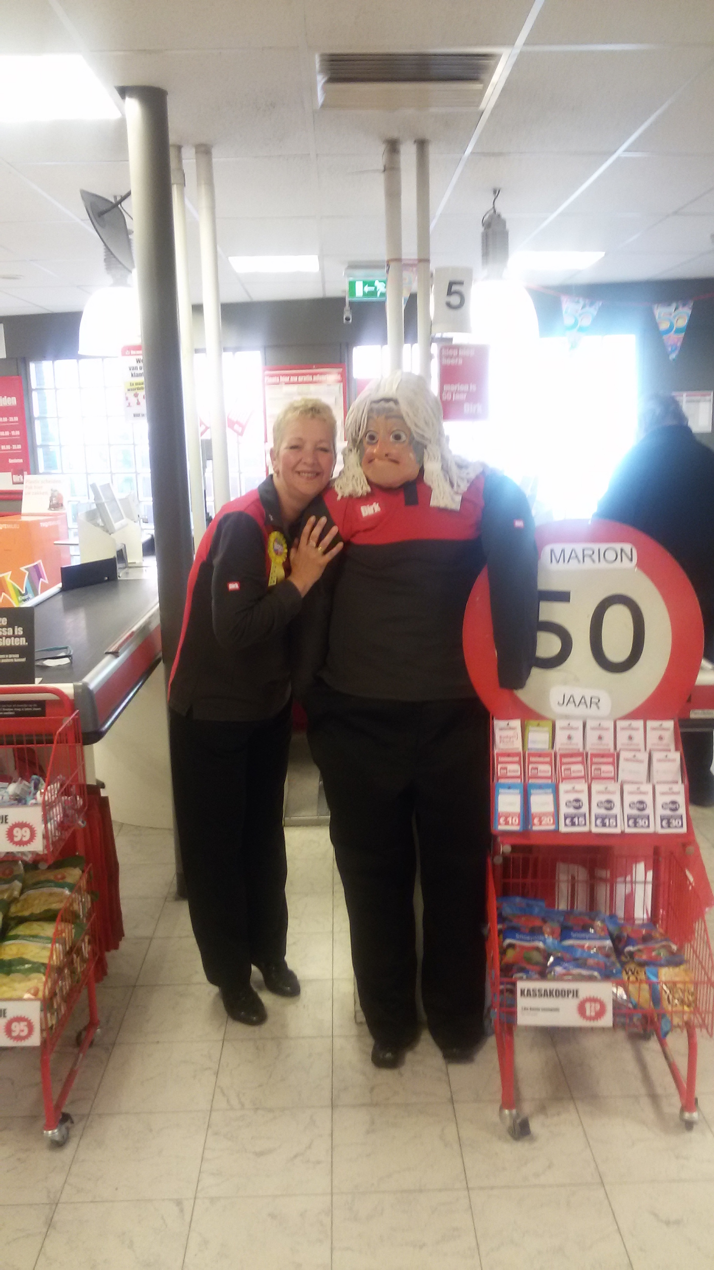 Marion Meijer, een van de vertrouwde gezichten van Dirk van den Broek, is 50 jaar geworden. Het zal vele klanten niet zijn ontgaan, want de versiering maakten melding van deze mijlpaal. Er was zelfs een Sarah bij de kassa geplaatst. Namens de collega’s wordt de kersverse Sarah nogmaals gefeliciteerd.