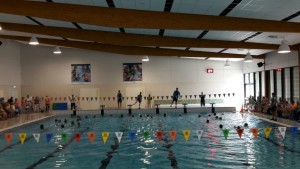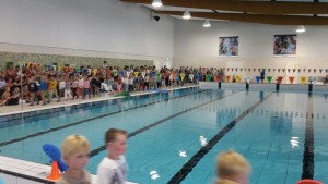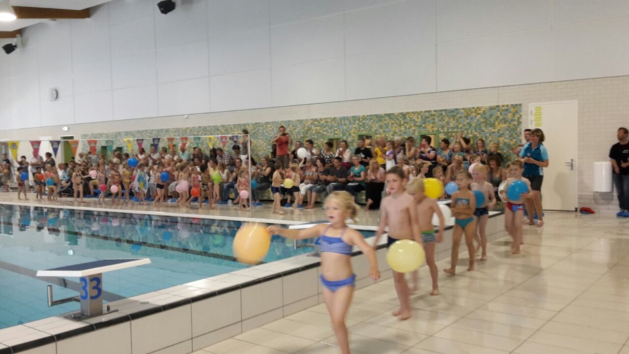 Afgelopen weekend mochten er weer veel kinderen diploma zwemmen in het prachtige zwembad van Markelo. Er gingen maar liefst 31 kinderen op voor hun A-diploma, 59 kinderen voor diploma B en 10 kinderen voor diploma C. Het ging supergoed, het was een groot feest. Uiteraard kwam er weer de vraag, of een van de ouders als eerste door het gat wilde duiken. En dat wilde Henny Alink, zwemtrainer bij De Hof, natuurlijk wel, hij was aanwezig omdat zijn kleinzoon Daan Alink voor A af ging zwemmen. Als rapporteur van de NRZ was de de heer Bert Mazee, controleren hoe het er in Markelo aan toe ging bij het diploma zwemmen, hij sprak de ouders toe met lovende woorden. De kinderen zwommen keurig, maar iedereen kreeg wel de boodschap mee, blijven zwemmen met je kinderen!!! Zwemmen is toch het leukste dat er is!!