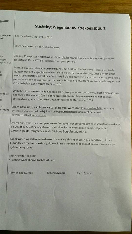 Wagenbouwers Koekoek gooien handdoek in de ring