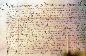Het moeilijkste werk begint nu. Het bestuderen van tal van bijna onleesbare oude akten – zoals hierboven afgebeeld – vergt veel tijd. In de loop der jaren hebben door annexatie, die al begon in 1800, nogal wat grenswijzingen plaats gevonden omdat Goor bijna niet kon uitbreiden. Alles wat bijvoorbeeld aan de andere kant van de spoorlijn ligt, behoorde bij de gemeente Markelo. Ook de aanleg van het Twentekanaal heeft nogal wat veranderingen veroorzaakt. De vaststelling van de oorspronkelijke begrenzing zal dan ook veel tijd vergen.