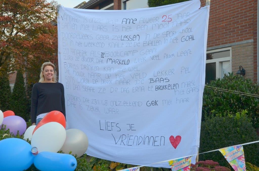 Anne Oplaat viert vandaag haar 25 ste verjaardag. Gisteravond plaatsten vriendinnen al een enorm spandoek met toepasselijke tekst aan de Loosboersstraat en werd er alvast een gezellig feestje gevierd tot diep in de kleine uurtjes. Ondanks dat was deze halve Saar vanmorgen al weer vroeg van de partij om te “bootcampen” met haar zaterdagmorgengroep. Familie, buurt, vrienden en vriendinnen willen Anne van harte feliciteren met haar verjaardag en wensen haar een super fijne dag toe.