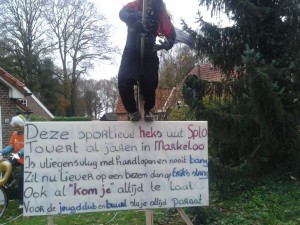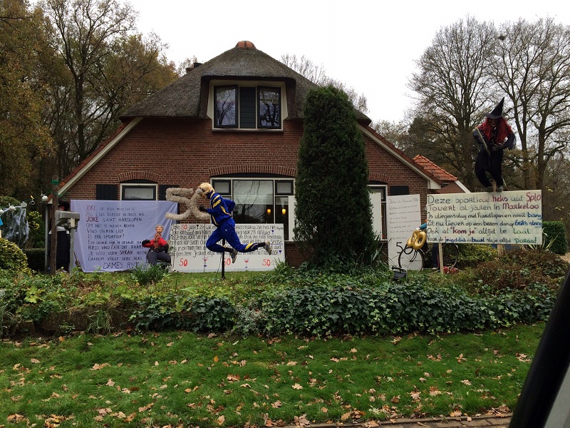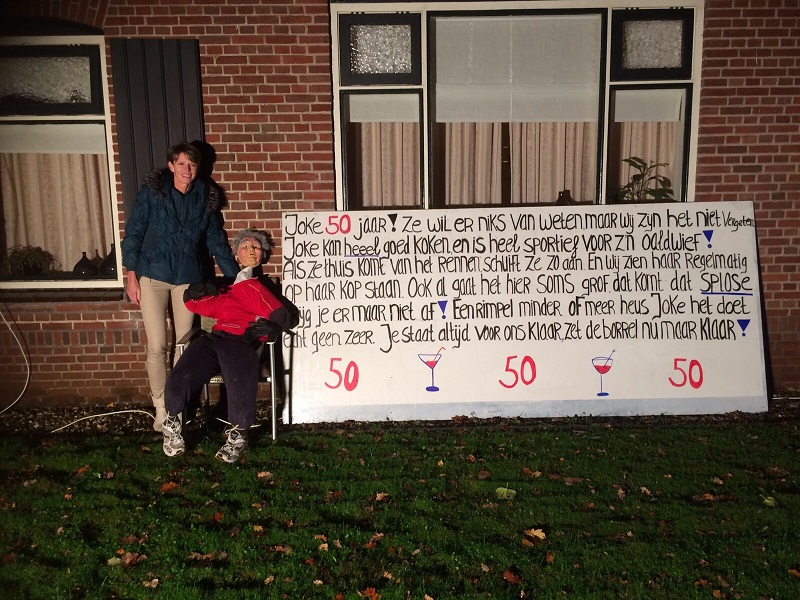 Opnieuw een 50 jarige aan de Rijssenseweg in Markelo. Dit keer is het de beurt aan Joke Stevens, die vandaag precies 50 jaar is geworden. Joke is afkomstig uit Espelo, maar woont al jaren met haar man Erik en drie dochters aan de Rijssenseweg. Daar was het gisteravond dan ook erg druk toen familie en vrienden haar kwamen bezoeken om een aantal Sarah’s met bijbehorende borden en spandoeken te plaatsen. Natuurlijk werd er ook alvast een klein voorschot genomen op het feestje dat a.s. vrijdag plaats vind. Joke, namens iedereen van harte gefeliciteerd en maak er een mooi feestje van.