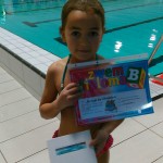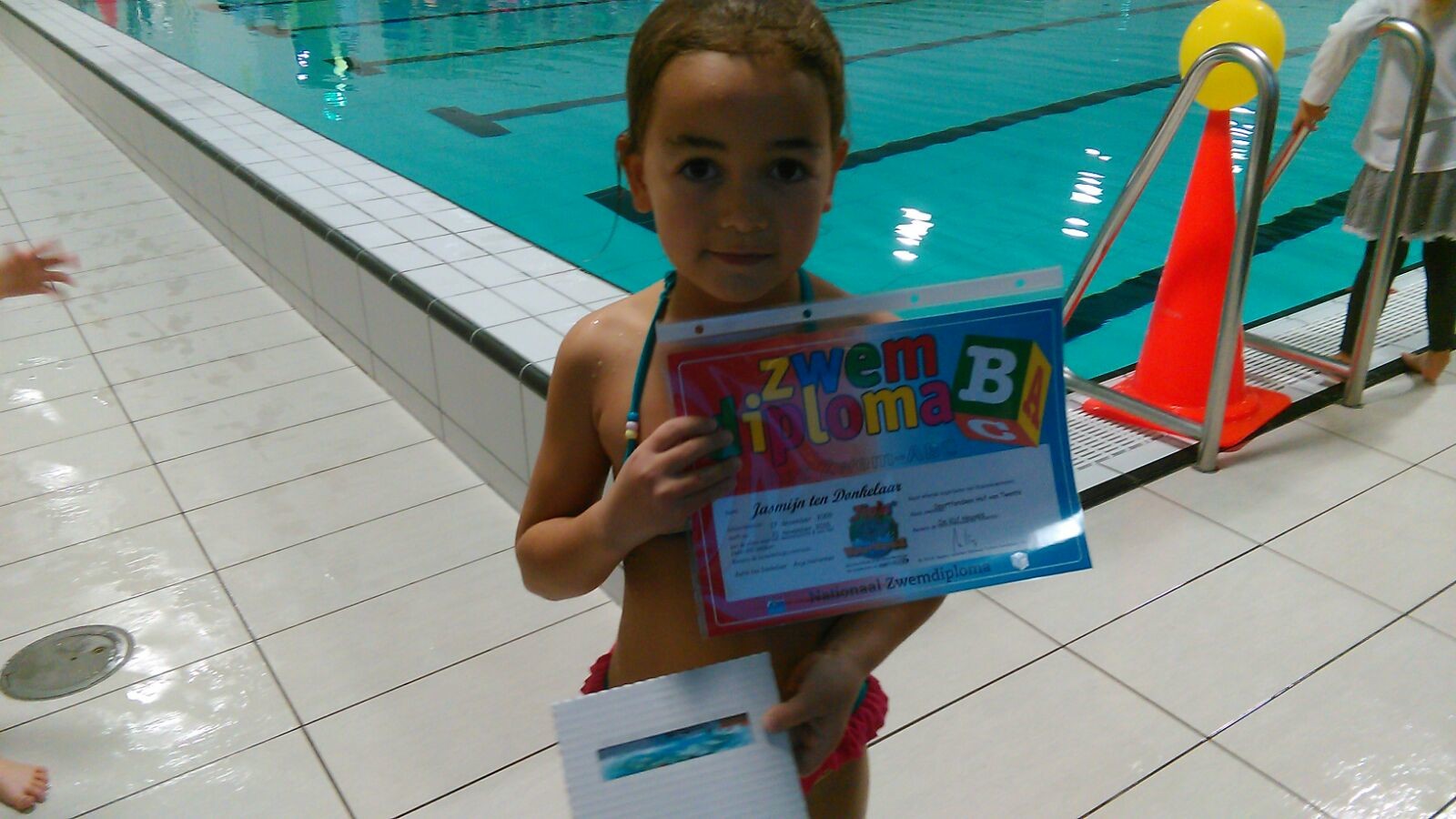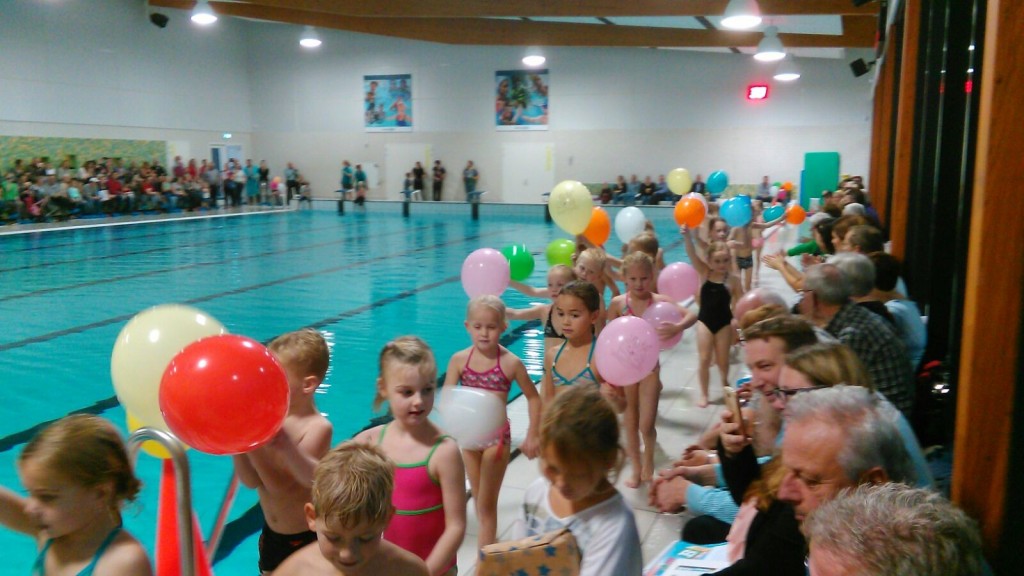 Afgelopen zaterdag was er weer diploma-zwemmen in zwembad ‘De Vijf Heuvels’. Maar liefst 30 kinderen mochten op voor hun A-diploma, 36 kinderen voor het B-diploma en 5 kinderen voor het C-diploma. Natuurlijk hadden de badjuffen er ook nu weer één groot feest van gemaakt. Uiteraard vroegen zij of iemand van de ouders misschien ook door het gat wilde duiken. Bij de A groep nam de mama van Allison Hargeerds deze uitdaging aan en onder luid applaus dook ze met kleding aan door het gat. Bij de C-groep was het de papa van Qun Bekhuis, hij dook maar liefst 9 meter onder water.
