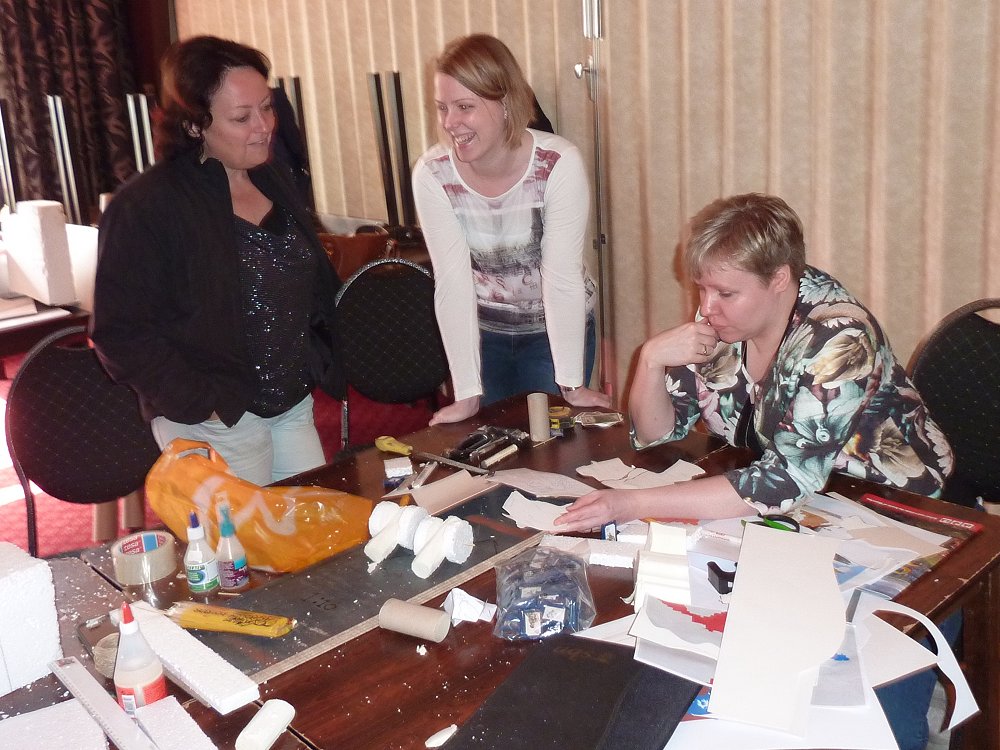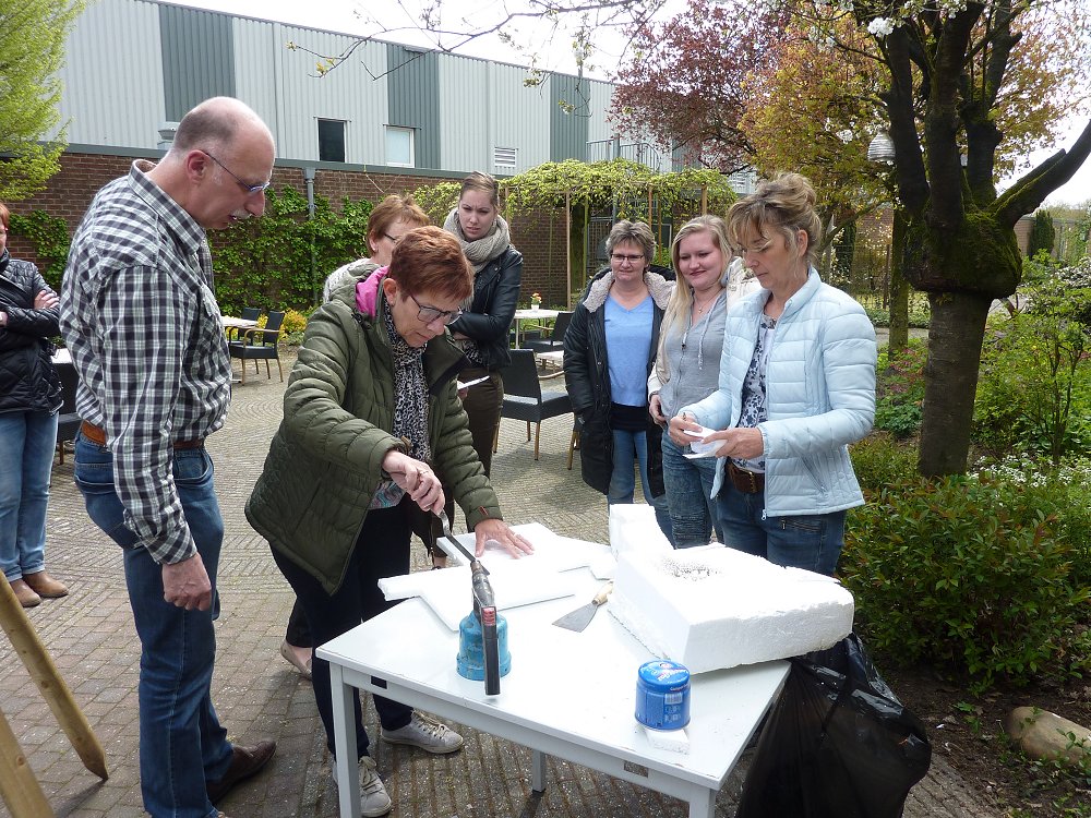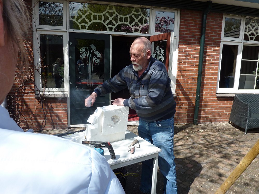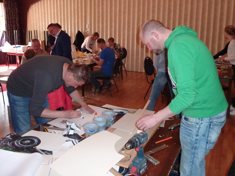 Willem Niessink heeft samen met Erik Bouwhuis de zeer praktische cursus/informatie middag opgezet. “Het gaat in hoofdzaak om twee belangrijke aspecten van wagenbouwen. Het gaat om snel goed resultaat te krijgen en zo goedkoop mogelijk. Vaak worden er grote bouwen van hout op een wagen geplaatst waar ook karton goed zijn werk kan doen”, vertelt Willem Niessink met een brede glimlach. “Door karton in stroken te snijden en gekruist op elkaar aan te brengen is het erg stevig en je kunt er allerlei vormen van maken. Tevens is het goedkoop om het te slopen en af te voeren”, aldus Willem. Dit was maar één van de vele voorbeelden welke de Creatieve Commissie van Dorpsfeest Markelo heeft uitgewerkt. Zo waren er onder ander voorbeelden met piepschuim en purschuim.