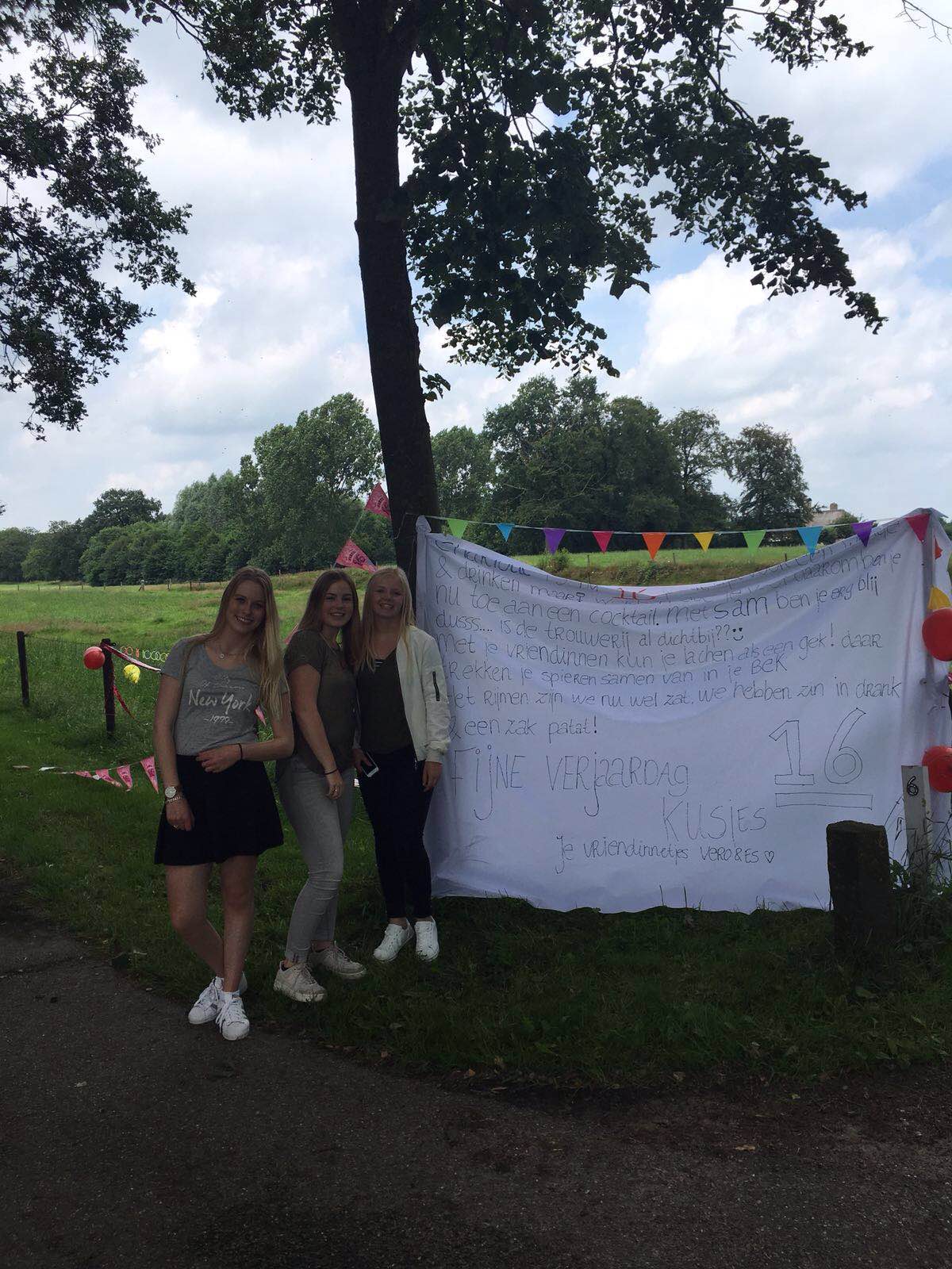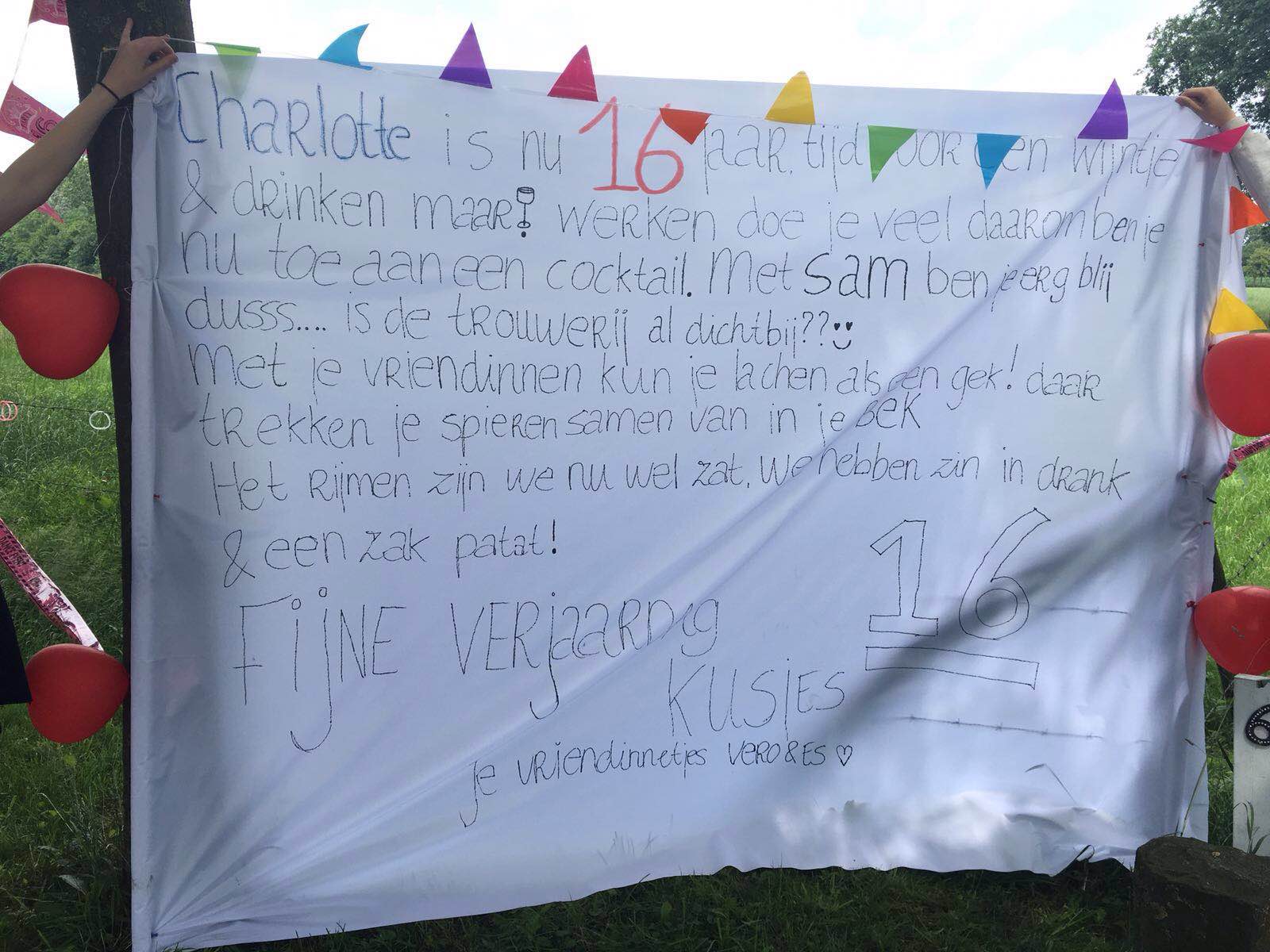 Vandaag viert Charlotte Ulfman haar 16de verjaardag. Door haar vriendinnen Veronique en Esmee werd zij vandaag verrast met een leuk spandoek. Charlotte, namens Veronique en Esmee nogmaals van harte gefeliciteerd met je verjaardag!