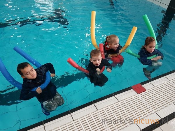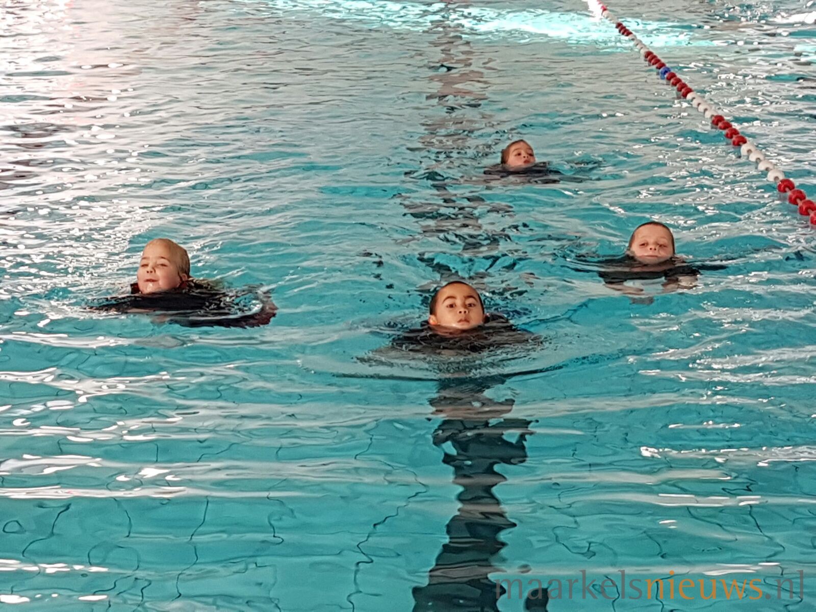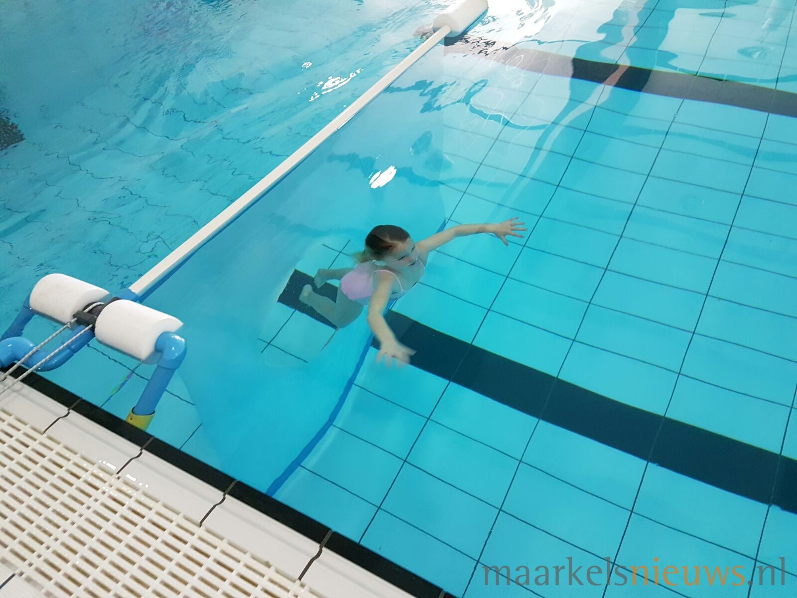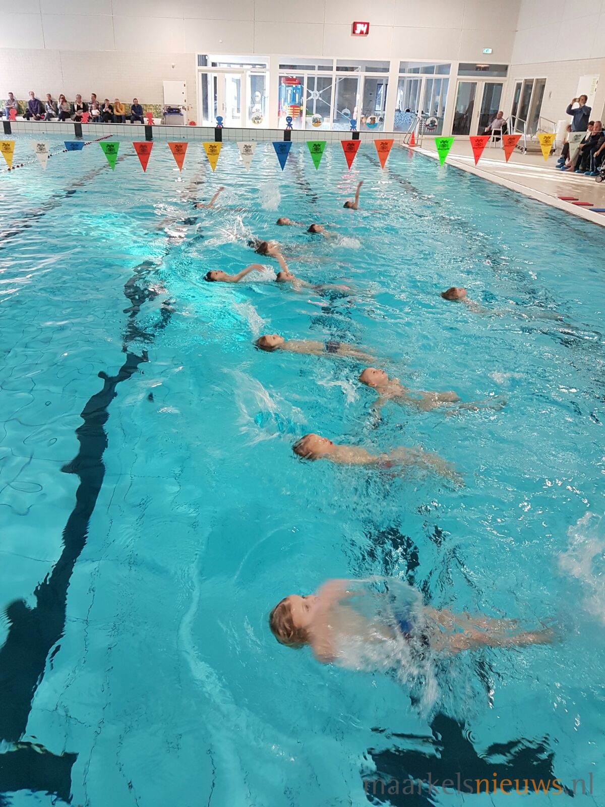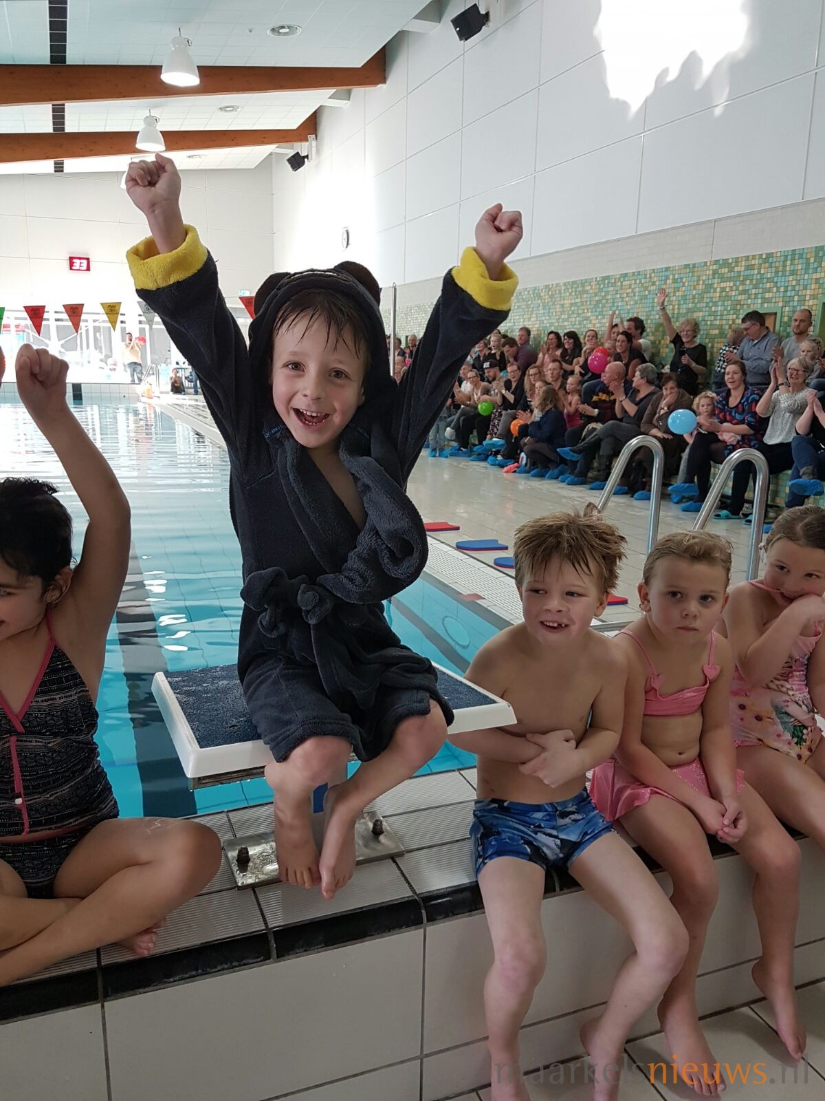 Gistermiddag mochten maar liefst 64 kinderen afzwemmen voor hun A, B of C diploma in het Sportfondsenbad De Vijf Heuvels aan de Potdijk in Markelo. Terwijl het buiten vroor en het landschap wit was, was het lekker warm in het zwembad en was er alle reden voor een feestje. Voor diploma A stonden maar liefst 35 kinderen aan de badrand klaar om te laten zien wat zij de afgelopen periode hadden geleerd. Hiervan hebben 13 kinderen meegedaan aan de snelcursus waarin zij in 20 weken klaar gestoomd zijn om af te kunnen zwemmen. Voor diploma B zwommen 25 kinderen af en 4 voor diploma C. De papa van Fien Pruntel mocht als eerste laten zien hoe je met kleren aan door het ‘gat’ kunt duiken wat natuurlijk werd beloond met een luid applaus door alle ouders, kinderen en het badpersoneel