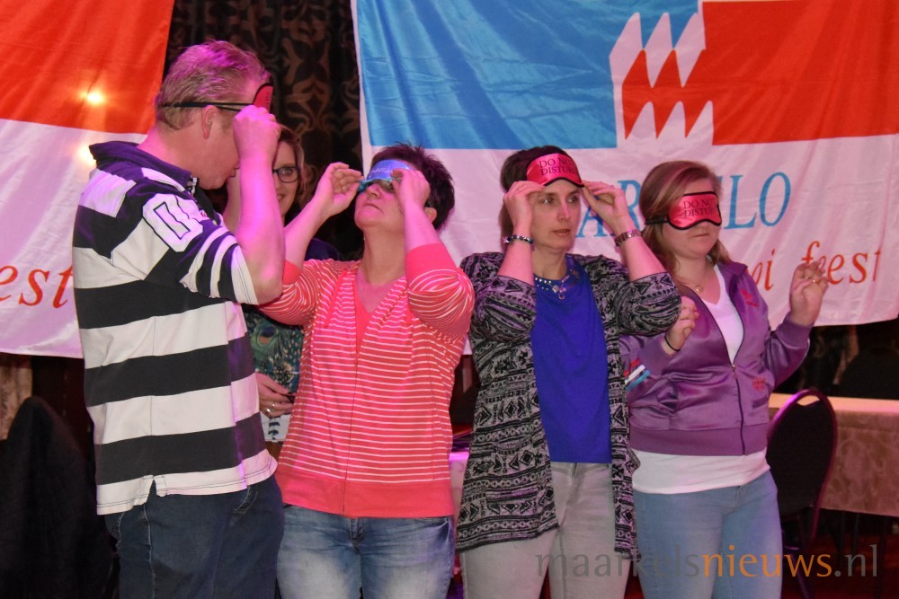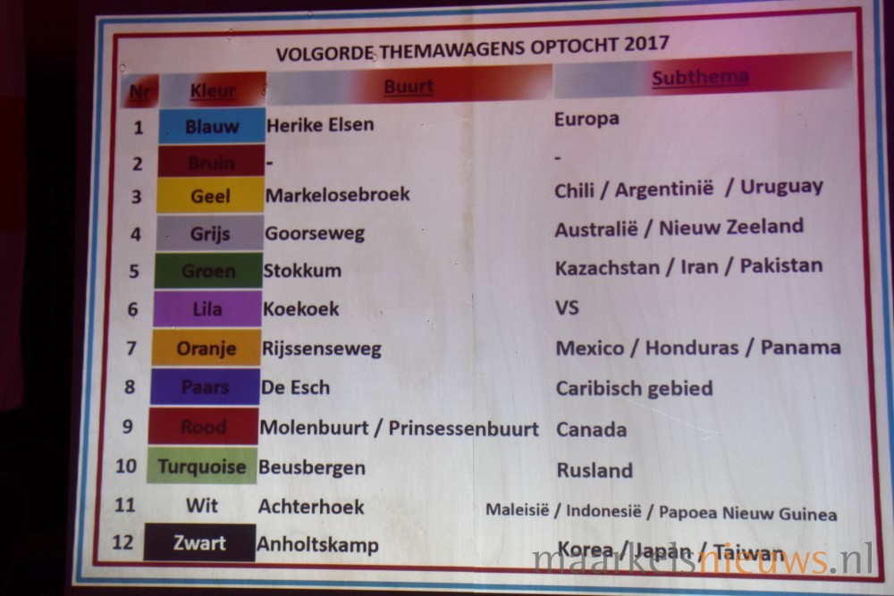 ‘Hew aait zo doane’ is het thema van de optocht van Dorpsfeest Markelo 2017. Op hilarische wijze zoals we dat al een flink aantal jaren gewend zijn van de optochtcommissie werd vanavond tijdens de trekking toegewerkt naar de onthulling van het thema van de optocht. De buurten werden bij De Haverkamp welkom geheten door de optochtcommissie en gevraagd om een aantal persoonlijke gegevens zoals leeftijd, gewicht, schoenmaat en lengte van vier personen uit de buurt op te schrijven en een kleur te kiezen. Vervolgens werd op een parodie van de spelquiz ‘de jongens tegen de meisjes’ voor de pauze een aantal snelle spelrondes gespeeld. Na de pauze werden de uitslagen vertaald in subthema’s voor alle buurten en maakte Ans van Hinte, voorzitter van de optochtcommissie het thema bekend.