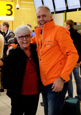Voor de één was het een plezierig weerzien met omhelzingen, kussen en een traantje, wat anderen stonden wat onwennig rond te kijken in de voor hen nieuwe omgeving. Dat was het beeld bij de aankomst van de eerste groep Canadese gasten in het kader van de derde en laatste Frank Graham Cycle Liberation Tour. Het waren met name de jongeren die deelnemen aan deze gecombineerde fiets- en bustocht en hun begeleiders. Zij landden vanmorgen tegen tien uur op Schiphol maar het duurde langer dan was voorzien aleer ze in Markelo aankwamen. Een file vanwege een ongeluk bij Amersfoort zorgde voor de nodige vertraging maar even voor half twee kwam de bus aan bij Branch 1 De Haverkamp. Daar werden de overzeese gasten welkom geheten door het Markelose Canada Comité bij monde van voorzitter Gert Jan Oplaat en door hun gastgezinnen in de zaal die was opgefleurd met de tulpensoort die binnenkort officieel wordt gedoopt als de Frank Graham Tulp. Morgen volgt er een nadere kennismaking met de Markelose jongeren die meefietsen met de tocht die woensdag officieel van start gaat.