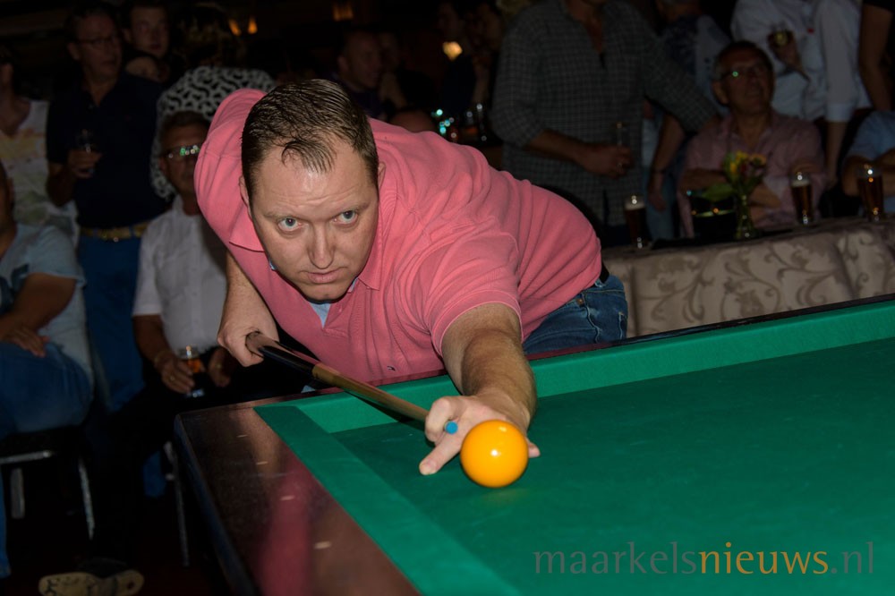 De uitdrukking ‘driemaal is scheepsrecht’ geldt zeker voor Freddy Vogel. Vanavond stond hij voor de derde keer in de finale in de strijd om de titel Biljartkoning van Markelo. Han Romp – die zich in 2012 ten kostte van Patrick Vogel tot Biljartkoning kroonde – viel ten prooi aan Freddy. Hij had 32 beurten nodig om z’n 65 caramboles te behalen. Han maakte het in zijn nabeurt nog spannend, maar bleef steken op 49 caramboles waar hij er 50 nodig had. Eerder op de avond was Han te sterk voor Eddy Schuurman en wist Freddy van Wim Gossink te winnen in zijn halve finalepartij. Freddy mag zondag samen met Natacha plaats nemen in de koets tijdens de optocht.