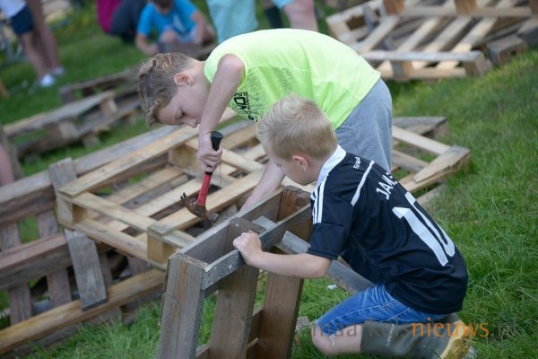 250 enthousiaste kinderen zijn vanmorgen begonnen met dé afsluiting van de zomervakantie: Houtdorp 2017. Wethouder Harry Scholten verzorgde vanmorgen de officiële aftrap voor de bouwactiviteiten in de weide bij Herberg De Pot. “Fantastisch om fanatieke kids samen met hun ouders aan het timmeren en zagen te zien,” aldus de wethouder. Dat men fanatiek was bleek al snel: het hout was binnen 5 minuten al weg. In zonnige omstandigheden verrezen vervolgens in no-time diverse nieuwe tijdelijke bouwwerken.