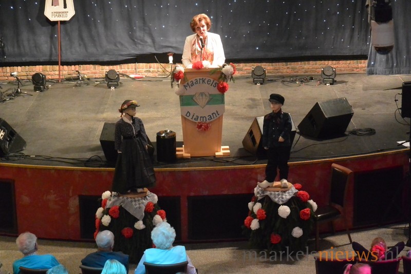 Voorafgaand aan het openbare gedeelte van het jubileumfeest opende burgemeester Ellen Nauta vanmorgen om 11.30 uur Maarkels Diamant na een welkomstwoord van voorzitter Arend Jan Heilersig. Nauta die zich als beschermvrouw aanbood voor de Folkloristische Vereeniging had veel lovende woorden voor de vereniging. Ook voorzitter Postumus van de Nederlandse Federatie Folkloristische dansen en voorzitter Groothuis van het District Oost spraken hun waardering uit voor de groep. Willemien Schoneveld roemde als voorzitter van Museumboerderij Eungs Schöppe de fijne samenwerking met de groep die de Eungs Schoppe als thuishaven heeft.