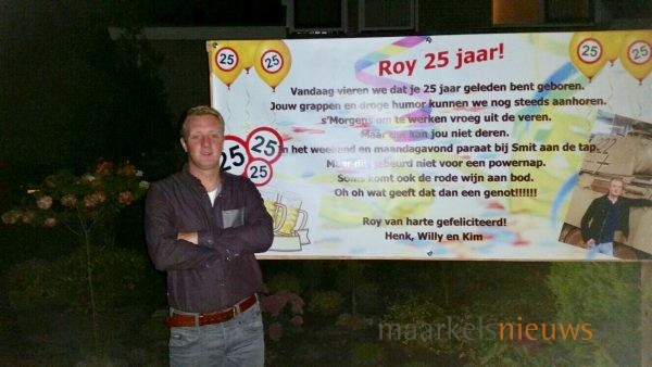 Vandaag viert Roy Krijgsman zijn 25ste verjaardag. Familie en vrienden wisten de halve Abraham gisteravond dan ook alvast te verrassen met spandoeken waarmee de tuin snel werd opgesierd. “Onze gezellige en humoristische vriend viert ook op deze dag zijn verjaardag bij ’t Wapen van Markelo! Daarom willen we hem ook graag op Maarkelsnieuws nogmaals van harte feliciteren met zijn 25ste verjaardag”, aldus de familie en zijn vrienden.