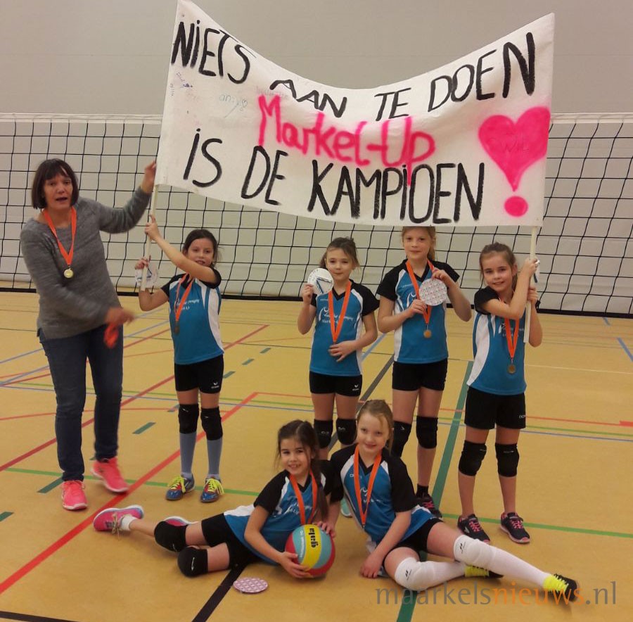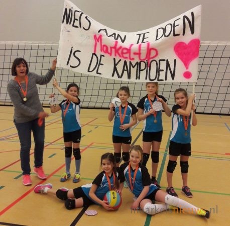 Volleybalsters Floor Harmelink, Anna Beuving, Milla Poorter, Lotte Harmelink, Naomi Rechterschot en Amy van Heuven zijn gisteren in Vroomshoop kampioen geworden met het minivolleybalteam 2.1 van Markel-Up. Het kampioenschap lag binnen handbereik, van de 6 sets moest er 1 gewonnen worden. De eerste set was het direct raak. Na de verdiende taart vertrok het team naar De Haverkamp waar patat klaarstond. Het team heeft dusdanige vorderingen gemaakt, dat ze in 2018 een niveau hoger gaan spelen.