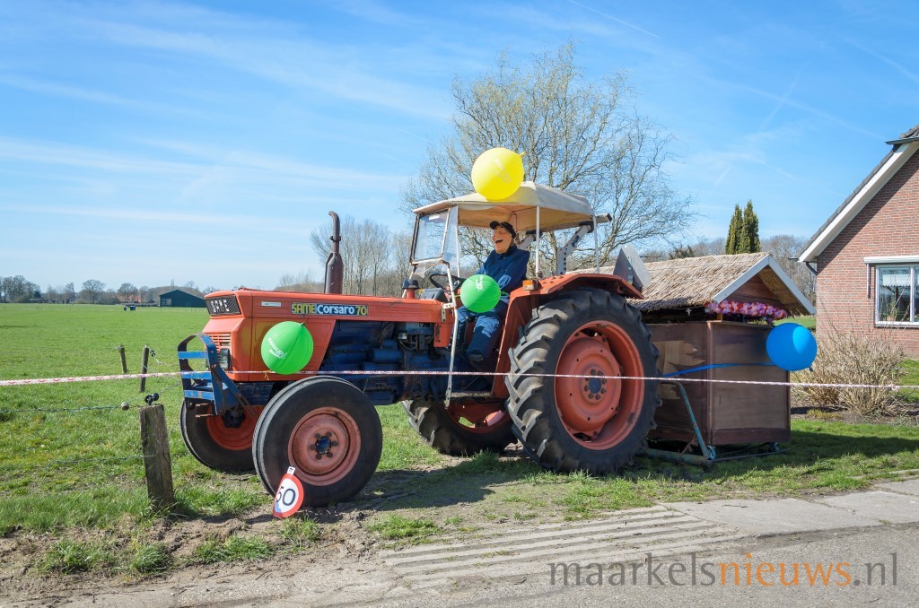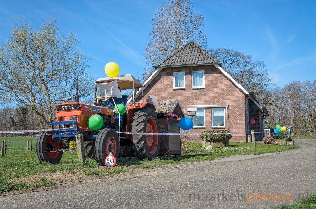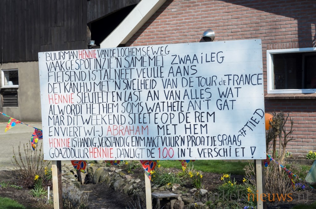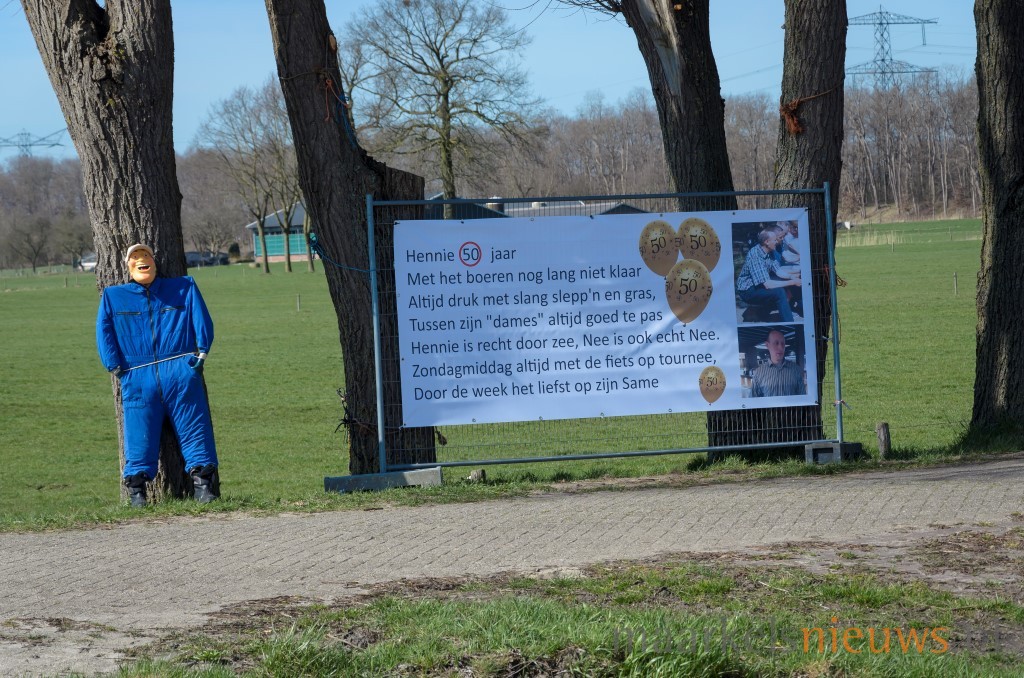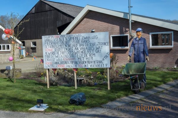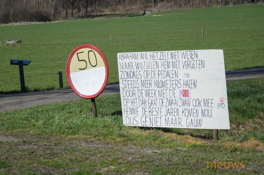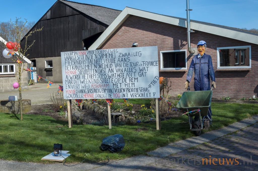 Familieleden, buren maar natuurlijk ook de kameraden van Hennie klein Bleumink hebben gisteravond het erf aan de Lochemseweg her en der wat opgesierd. Spandoeken, Abrahams maar ook een heuse Same en drankkeet kwamen er aan te pas om hem op passende wijze te laten inzien dat hij vandaag zijn vijftigste verjaardag viert. Daar de woning wat verder van de weg ligt, werd ook aan de Lochemsweg een spandoek, Abraham en wat borden met het getal vijftig erop geplaatst. Terwijl iedereen druk was met de aankleding van erf en toegangsweg moest Hennie echter aan het werk, want net op hetzelfde moment diende er zich ‘koe-kalverij’ aan. Maar iets later werd er gezamenlijk uitgebreid geproost op de Abraham. Hennie; namens de familie, buren en de kameraden nogmaals van harte gefeliciteerd met 50e verjaardag!