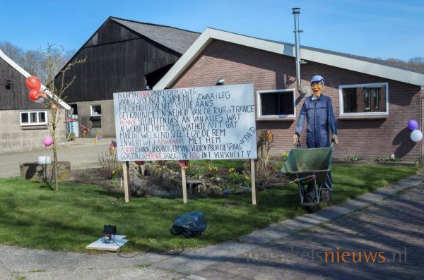 Familieleden, buren maar natuurlijk ook de kameraden van Hennie klein Bleumink hebben gisteravond het erf aan de Lochemseweg her en der wat opgesierd. Spandoeken, Abrahams maar ook een heuse Same en drankkeet kwamen er aan te pas om hem op passende wijze te laten inzien dat hij vandaag zijn vijftigste verjaardag viert. Daar de woning wat verder van de weg ligt, werd ook aan de Lochemsweg een spandoek, Abraham en wat borden met het getal vijftig erop geplaatst. Terwijl iedereen druk was met de aankleding van erf en toegangsweg moest Hennie echter aan het werk, want net op hetzelfde moment diende er zich ‘koe-kalverij’ aan. Maar iets later werd er gezamenlijk uitgebreid geproost op de Abraham. Hennie; namens de familie, buren en de kameraden nogmaals van harte gefeliciteerd met 50e verjaardag!