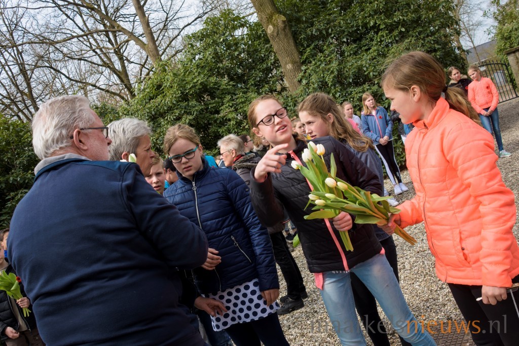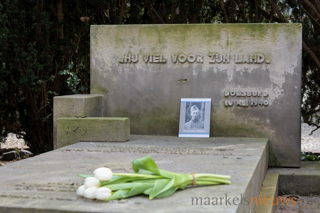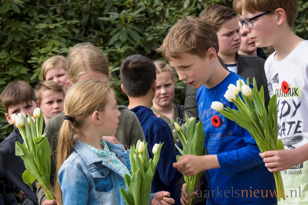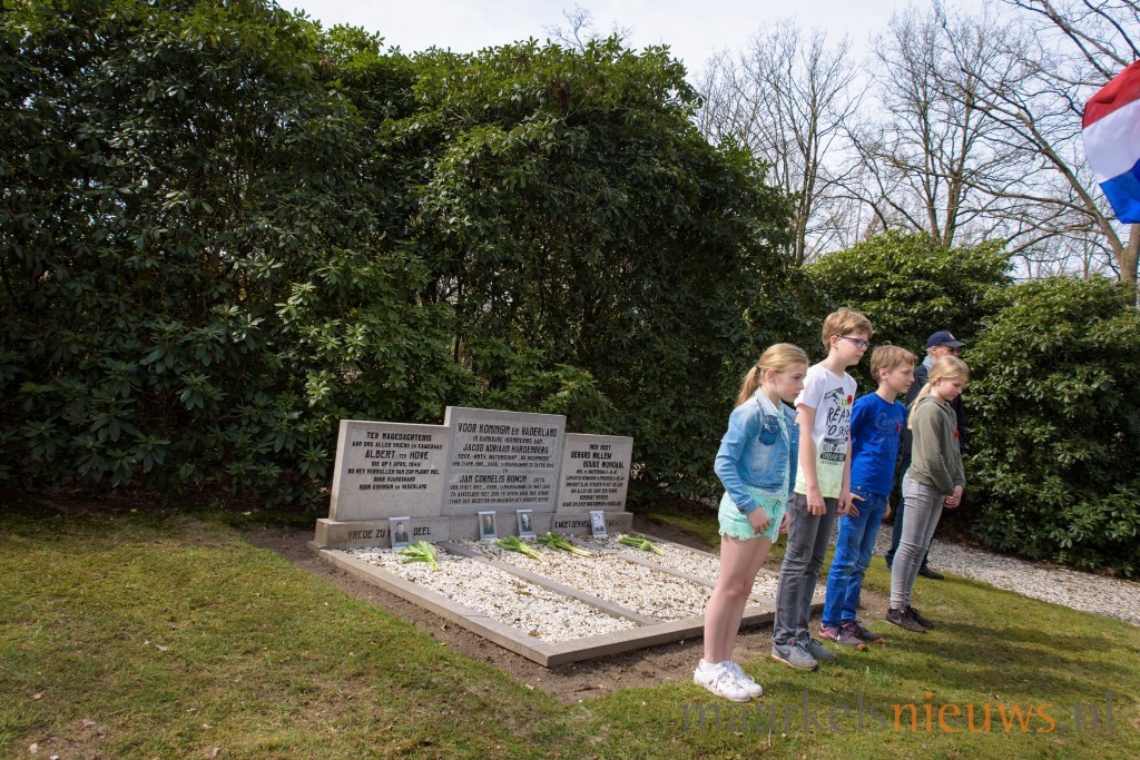 Tijdens de minuut stilte op het Ereveld van de Algemene Begraafplaats doet de lente langzaam zijn intrede. De leerlingen hebben zojuist alle oorlogsgraven voorzien van een tulp. De zonnestralen laten zich voorzichtig zien, de bloesem komt aan de bomen en de vogels zingen uit volle borst. Kortom daar waar nieuw leven in de lucht hangt, wordt er stil gestaan bij de jonge knapen, soms ver van huis, die hun leven hebben gegeven opdat wij in vrijheid kunnen leven. De foto’s van de gevallenen bij elk graf maken het herdenken tastbaarder. Ondanks dat we bij het verlies van hen stil staan, wappert de Nederlandse vlag in de top van de mast, omdat er ook stil gestaan wordt bij het einde van de bezetting van Markelo.