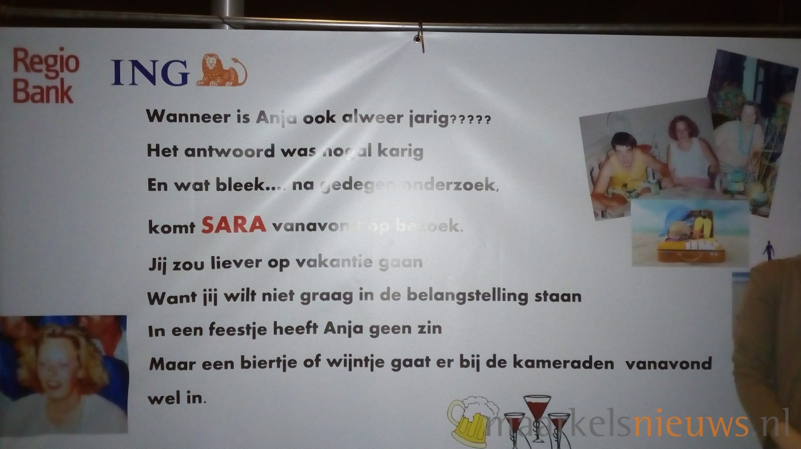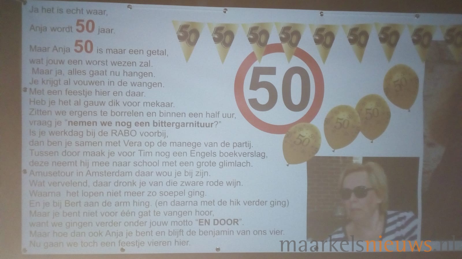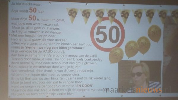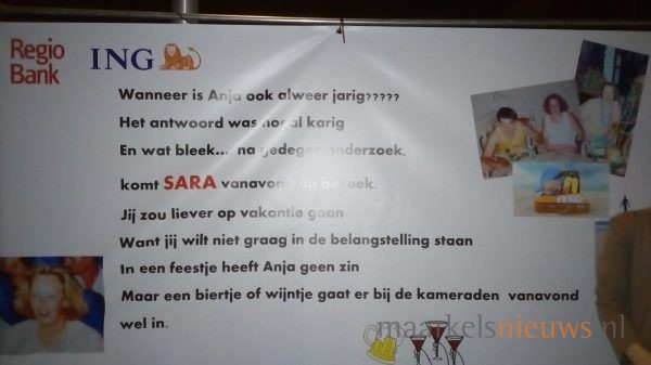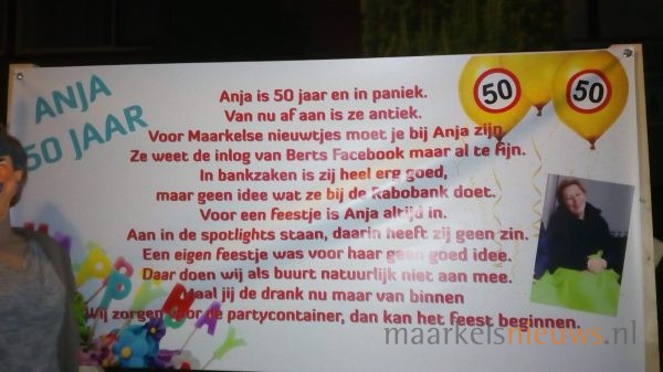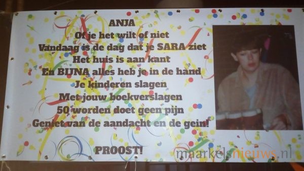 Anja Greven ziet vandaag Sarah. Gisteravond wisten familie, buurt en kameraden de kersverse Sarah al flink te verrassen door de tuin te versieren met een aantal Saartjes en natuurlijk spandoeken, voorzien van passende teksten. Het was dan ook nog lang onrustig aan de J C Romijnlaan in de Koekoek in Markelo. Anja; namens alle aanwezigen nogmaals van harte gefeliciteerd met je 50e verjaardag!