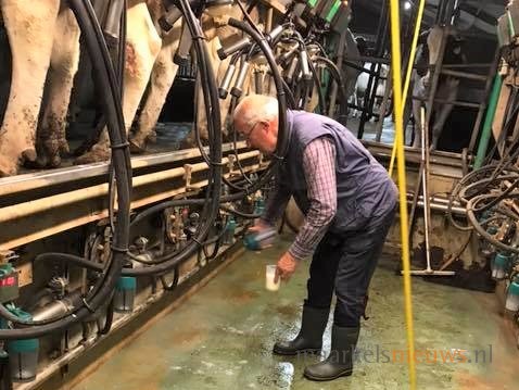 Bijna 20 jaar lang heeft Gerrit Kolkman als monsternemer bij menig melkveehouder in de melkput gestaan om monsters te nemen van de geproduceerde melk. Vanmorgen nam hij de laatste melkmonsters in de melkput van melkveebedrijf Lonink-Nijenhuis want Gerrit heeft besloten dat hij gaat stoppen op bijna 70-jarige leeftijd met zijn werkzaamheden die hij met veel passie uitvoerde voor het CRV. Zo wist Gerrit feilloos met welke koeien hij te maken had en kende hij zelfs de namen van het vee van veel veehouders. Een koeienliefhebber pur sang mogen we rustig zeggen als we naar zijn werkzaamheden informeren. In de laatste 20 jaar bezocht Gerrit als monsternemer voor het CRV zo’n 160 verschillende melkveebedrijven in de directe omgeving van Markelo. Na een kop koffie en de laatste nieuwtjes te hebben gedeeld aan de keukentafel van de veehouder startte Gerrit zijn werk en nam van elke koe een melkmonster om zo de kwaliteit en de productie van de melk te kunnen bewaken. Zo was Gerrit dan ook bij veel veehouders kind aan huis wat resulteerde in een fijne samenwerking met de veehouders.